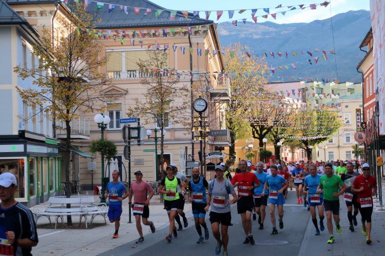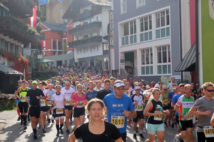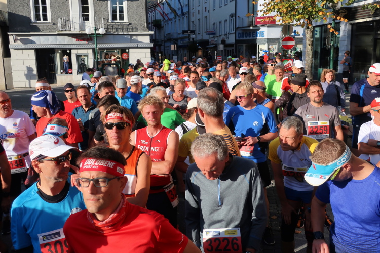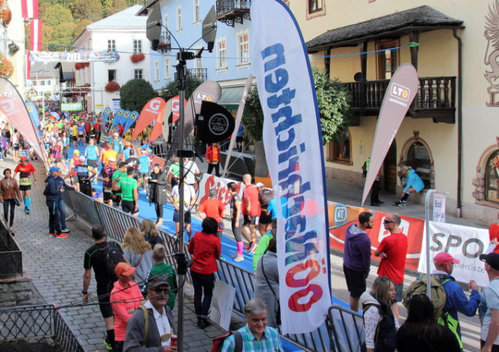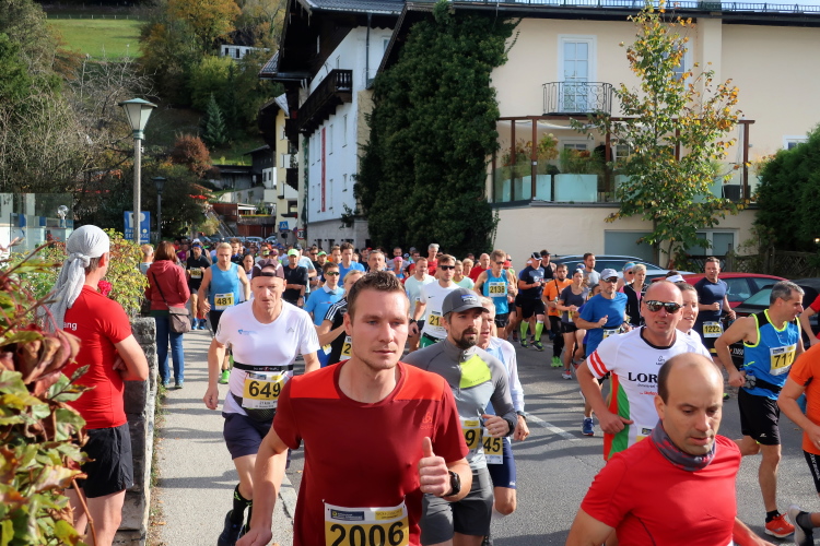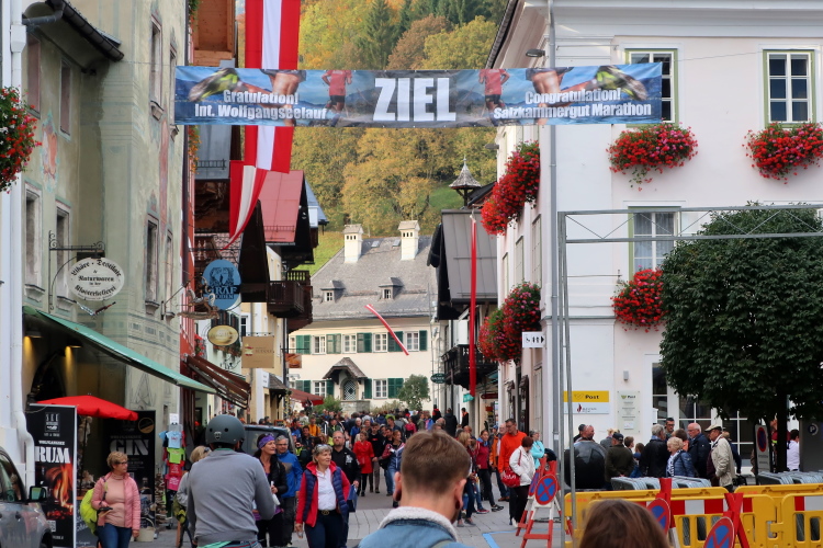 Dass der Lärm keineswegs nur uns gilt, merke ich allerdings schnell. Laute Musik und ein Countdown ertönt aus dem „Off“ der vom Kirchplatz wegführenden Pilgergasse. Gefüllt ist die Gasse mit unzähligen Läufern, konkret den Startern des zweiten der drei Blöcke des 27 km-Klassikers. Es ist Punkt 10:35 Uhr, als ich nach 15,3 km diesen Punkt und damit mein erstes läuferisches Ziel erreiche, rechtzeitig zum Start des Hauptlaufs einzutreffen. Ein kurzes Wegstück noch werde ich abseits und parallel zum Startkorridor geleitet, dann mündet mein Weg in die Pilgergasse ein und ich werde sogleich von der dichten Läufermasse verschluckt. Im Schwarm der gelben Startnummern geht meine rote völlig unter. Vorbei ist es mit dem unbedrängten Dahintraben, vorbei mit der Ruhe, aber hier ist dafür so richtig Stimmung. Das gehört zum Lauferlebnis am Wolfgangsee.