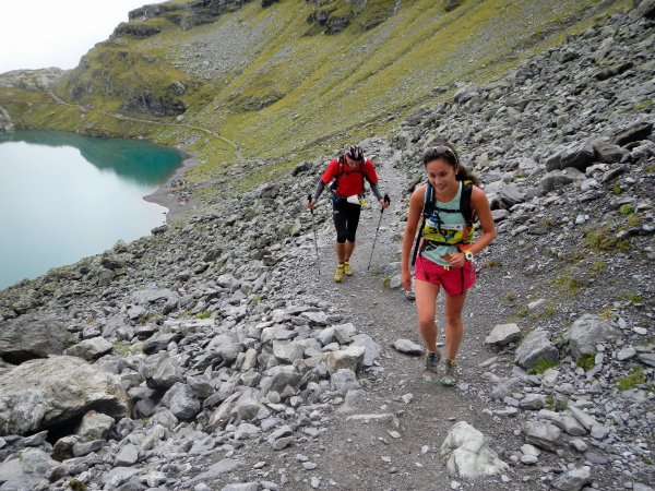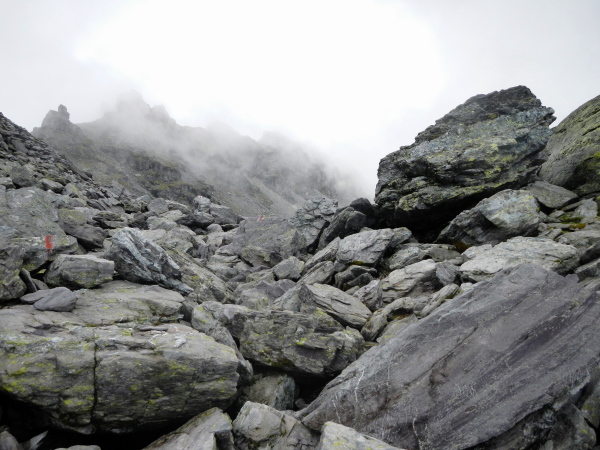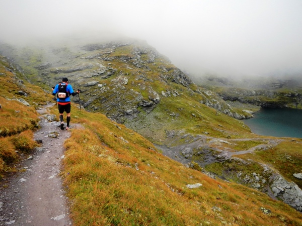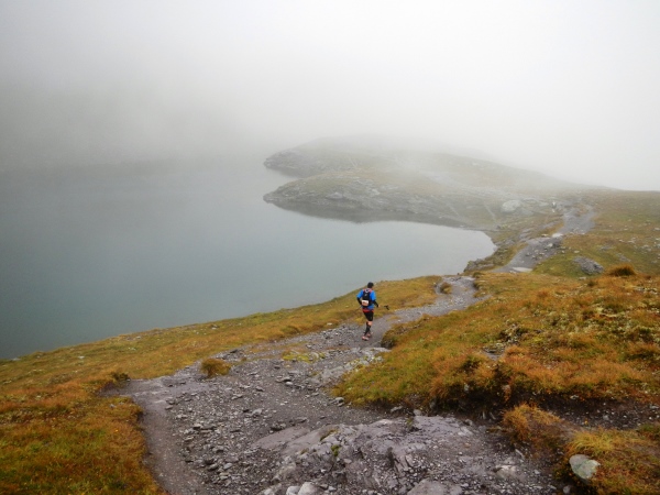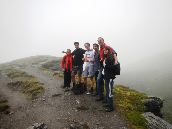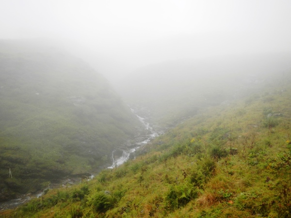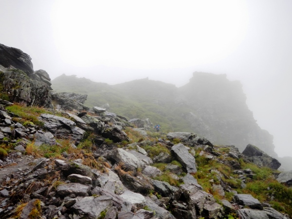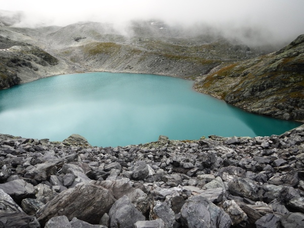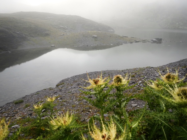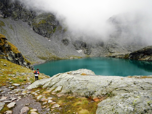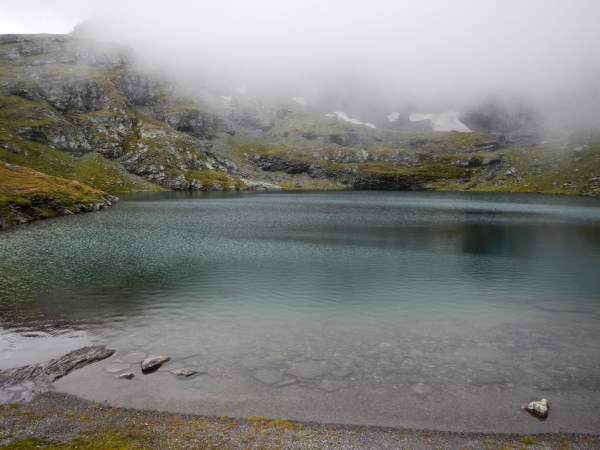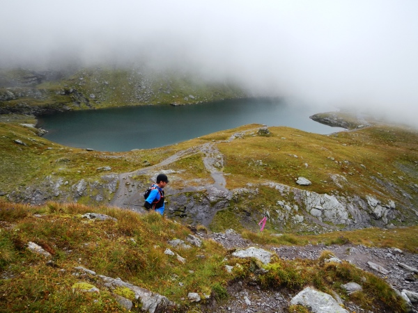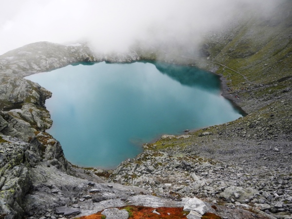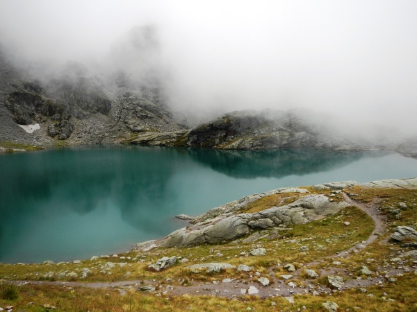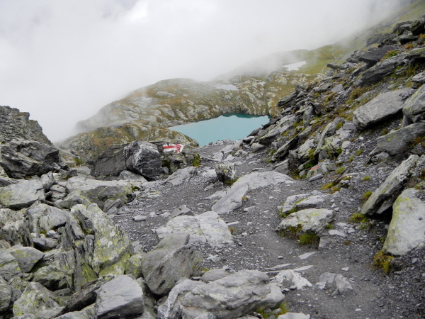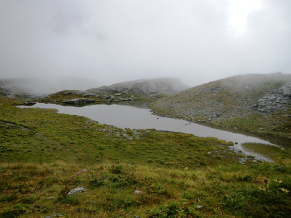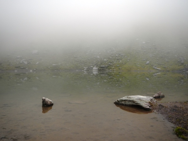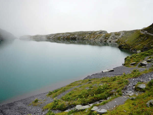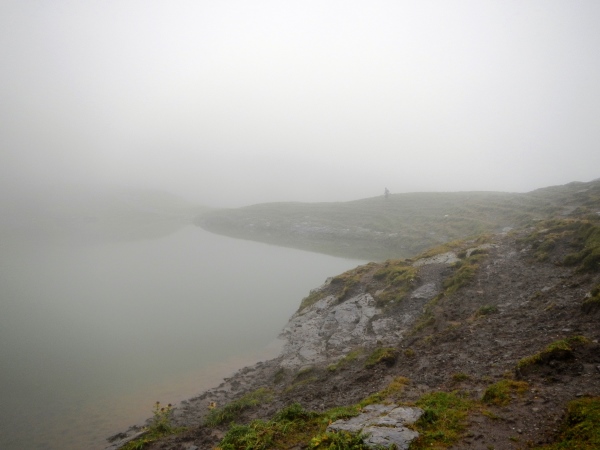 Nach Gaffia geht es gleich wieder hoch. Auch wettertechnisch, denn von regen ist nichts mehr zu spüren. Der Höhenwanderweg der 5-Seen-Wanderung ist gespickt mit kleineren und Tritte bildenden Steinen, insgesamt aber angenehm zu belaufen. Vom Baschalvasee ist nicht viel zu sehen, fast nahtlos geht die Wasseroberfläche über in den Nebel. Das hindert eine Gruppe junger Touristen nicht, sich ihres Ausflugs zu erfreuen.