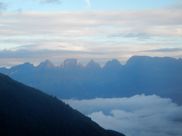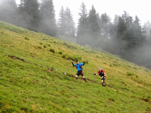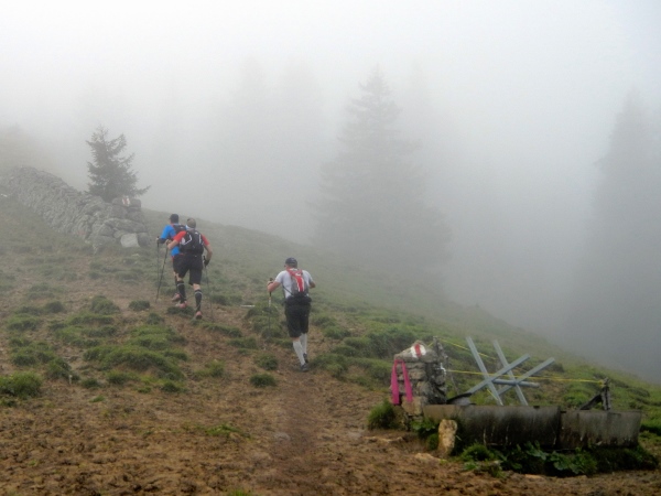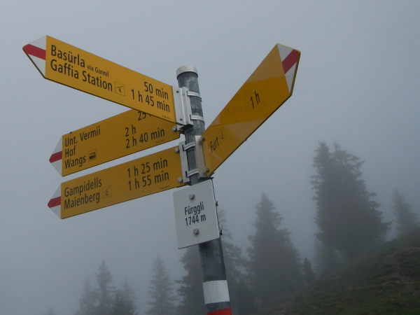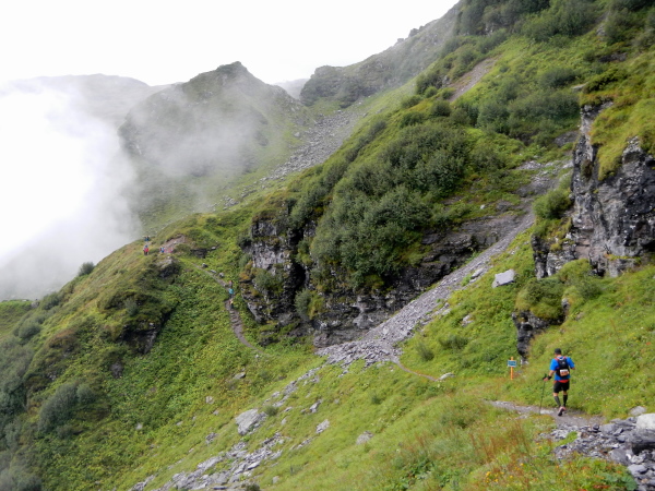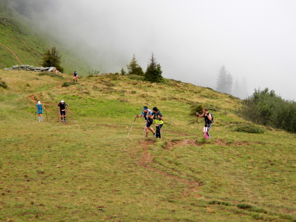 Der erste Streckenabschnitt ist geeignet zum Warmwerden. Wenig Steigung, einiges an sanftem Gefälle. Bis der Aufstieg zum Garmil beginnt, läuft die Maschine. Der Weg ist Natur pur. Kein Botox, kein Silikon. Die Falten bringen den Charakter so richtig zur Geltung, die weichen Hügel der Grasnarben geben ein wohliges Gefühl. Verführung pur. Und es kommt wie es in solchen Fällen kommen muss. Unter den Füßen fühlt es sich an wie auf Windeln. Bis jenseits des Quellvermögens vollgesaugt.