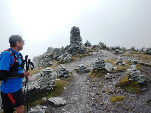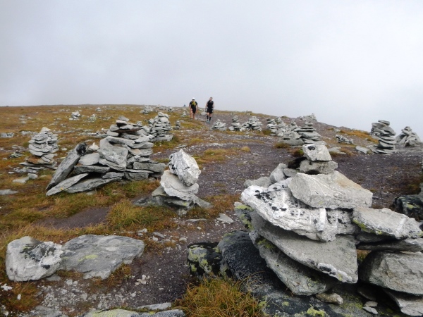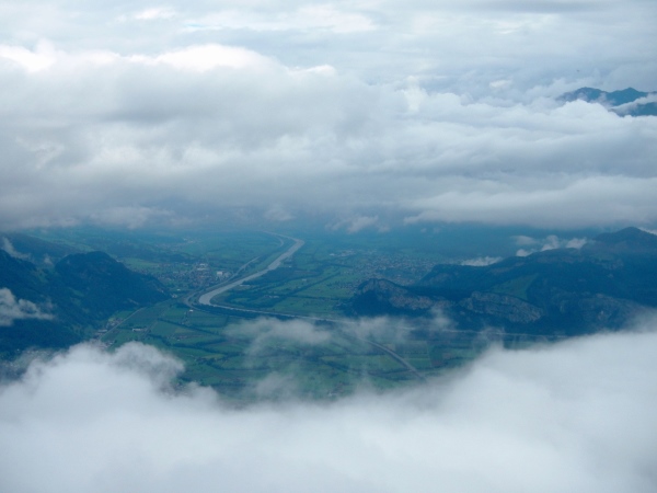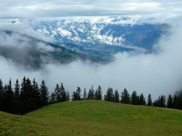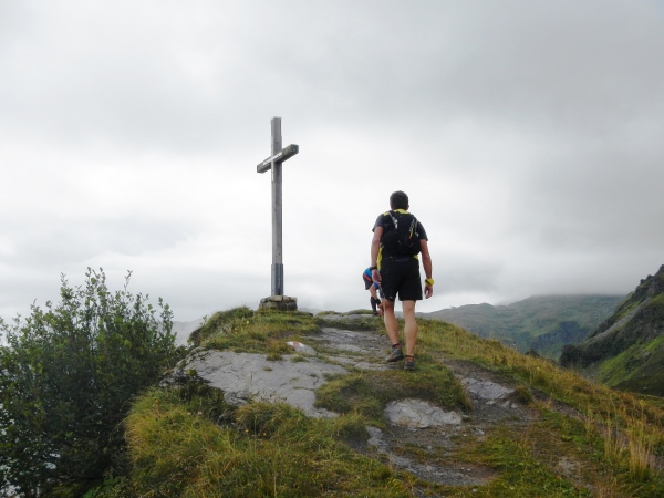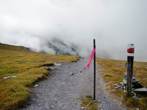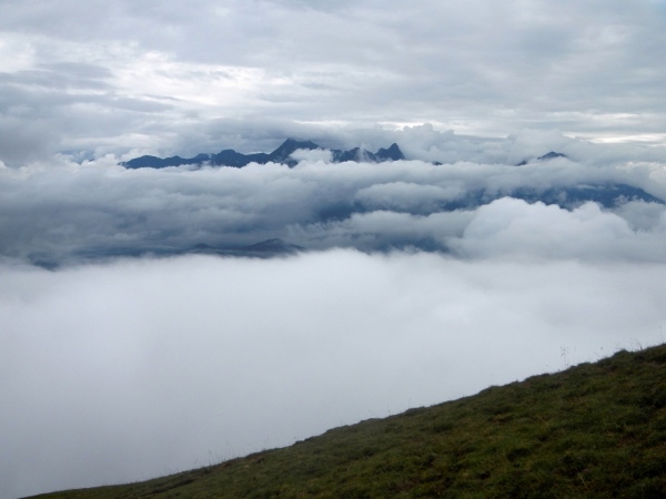 Nach dem Fotohalt beim Gipfelkreuz geht es hinunter in Wolken und Nebel. Sozusagen der Wickeltisch, von welchem der Kleine herunterpinkelt. Die volle Reihe der Lottozahlen sieht anders aus. Doch ich weiß nicht, ob ich die volle Aussicht bei warmem Wetter wirklich bevorzugen würde.