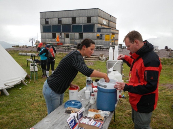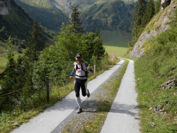 Die Steigung des Wirtschaftsweges ist moderat, dass er zur Beständigkeit seines Bestehens weiter oben geteert ist, wird sicher nicht von allen mit Begeisterung registriert. Dafür gibt es in einer der Kehren einen Brunnen und jemanden von der Alpin Rettung mit einer Kiste Gel und Riegel im Gepäck.