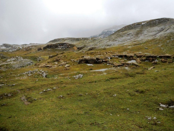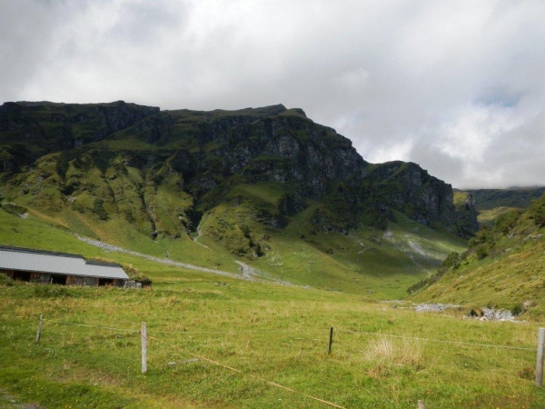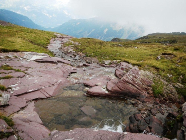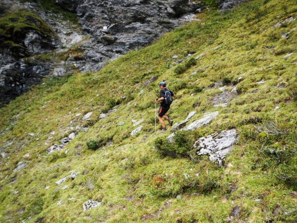Der Weg ist diesseits des Bachs gut erkennbar, weitgehend aber auch ein Rinnsal. Wer sich nicht jetzt schon total versauen will, tut gut daran, jeden Schritt zu planen. Weiter unten geht es in einer Schrunde zwischen schroffen Felsen in unzähligen Serpentinen hinunter auf die Alp Precht. Von Ober- bis Unterprecht folgen wir dem Wirtschaftsweg. Weniger Gefälle und weniger Konzentrationsaufwand bieten eine Erholungsphase. Ein überholender Läufer bemerkt, dass sich der Reißverschluss meines Rucksacks geöffnet hat und schließt ihn mir. Mein Gedanke danach ist: „Hoffentlich ist nichts herausgefallen!“