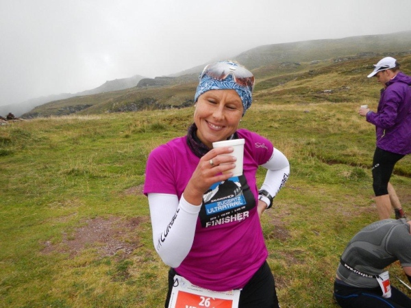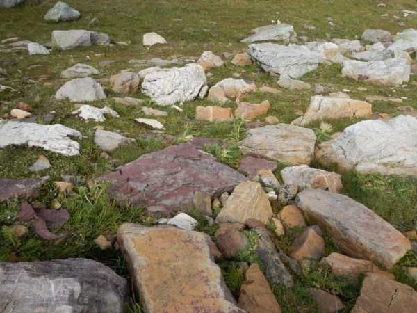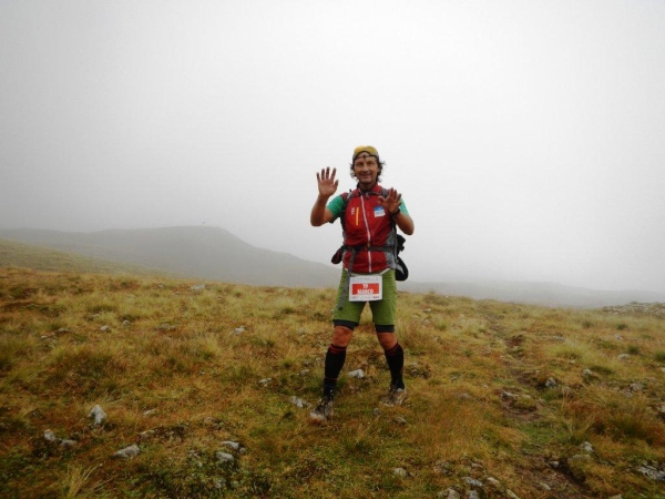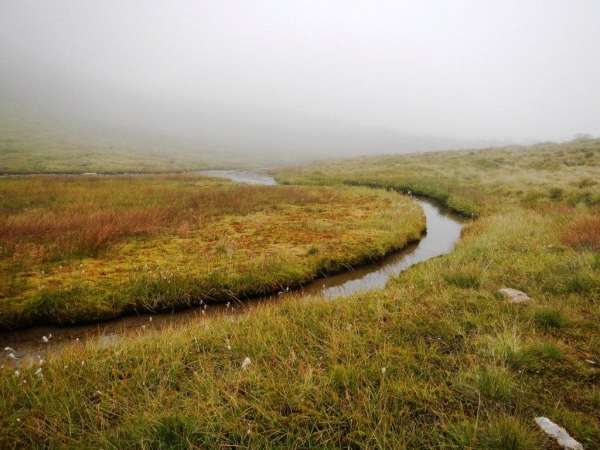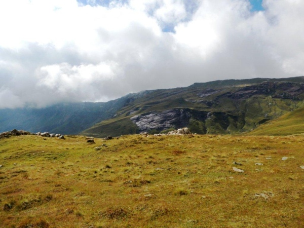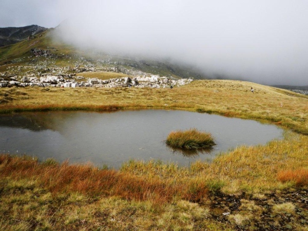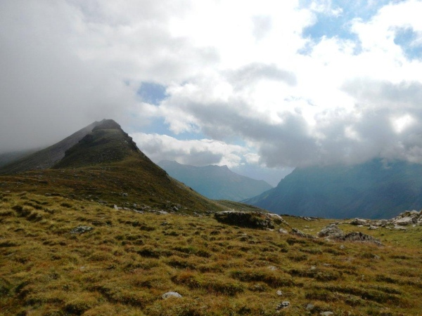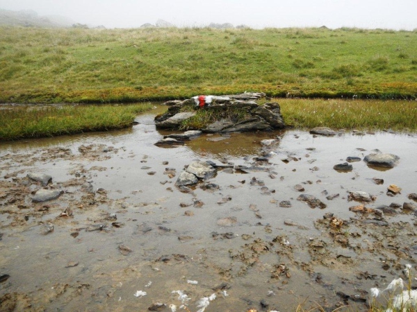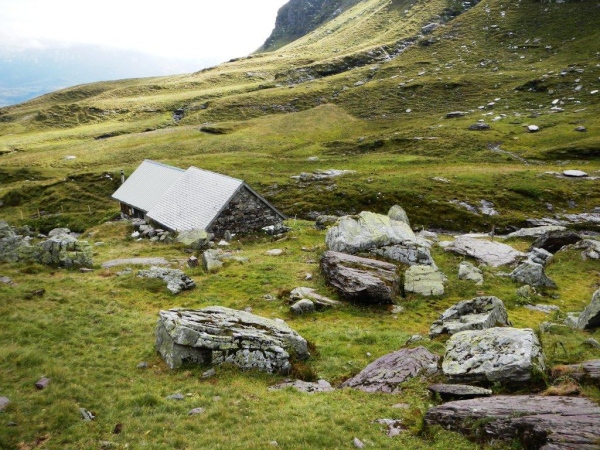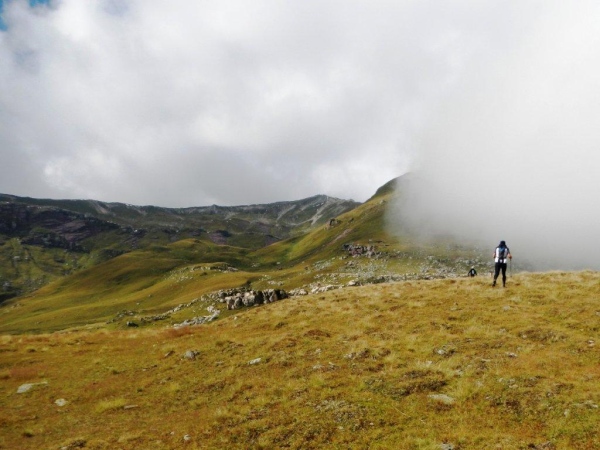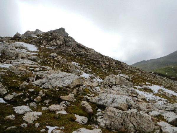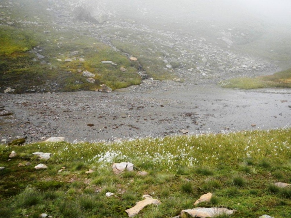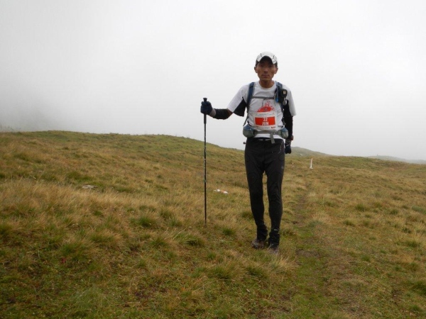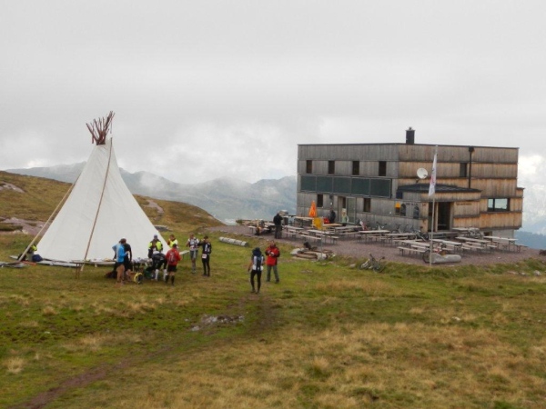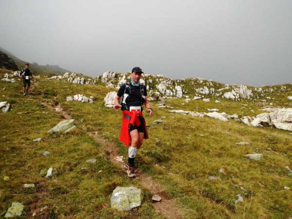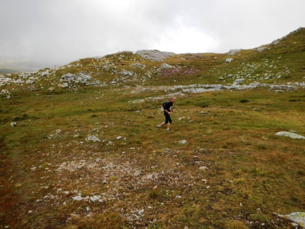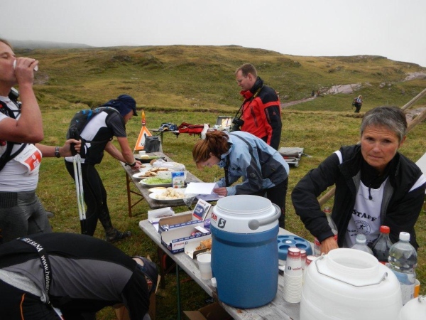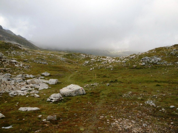 Umso mehr, als es nach Erreichen der Passhöhe vergleichsmäßig eben bis zur Spitzmeilenhütte weitergeht. Auch sonst ändert sich der Charakter der Landschaft sofort. Von Steinen und Felsen durchsetzte Schafweiden und Hochmoor prägen diesen Abschnitt. Als geologischer Schwachmat ohne jegliche Ahnung staune ich einfach wie ein Kind, dass auf kleinstem Raum Felsbrocken in verschiedensten Farben liegen. Noch näher beim Wendepunkt kommen Otto und ich zur Überzeugung, eben eine beträchtliche Summe Geld gespart zu haben. In dem uns nun umgebenden Nebel kommen wir uns in dieser Landschaft vor wie in Schottland. Läufer auf dem Rückweg geben uns immer wieder ungefähre Zeitangaben für unseren Countdown zur warmen Suppe. Vor der Spitzmeilenhütte ist wieder ein gut bestückter Verpflegungsstand aufgebaut, an welchem uns fürsorgliche Freiwillige verwöhnen und hinter welchem Sanis mit aufmerksamem Blick darauf achten, dass die Selbstwahrnehmung der Läufer mit der ihres medizinisch geschulten Auges übereinstimmt.