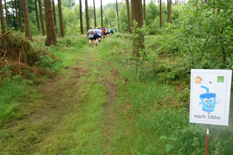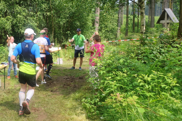 Ich greife einen Becher Iso und ein Stück Riegel. Weiter geht es auf frisch gemähtem Untergrund. Es ist zwar eine Plackerei immer wieder aufwärts zu laufen, aber es macht großen Spaß. Das ist so richtig nach meinem Geschmack heute. In einem Waldstück begleiten uns links und rechts Steinmännchen.