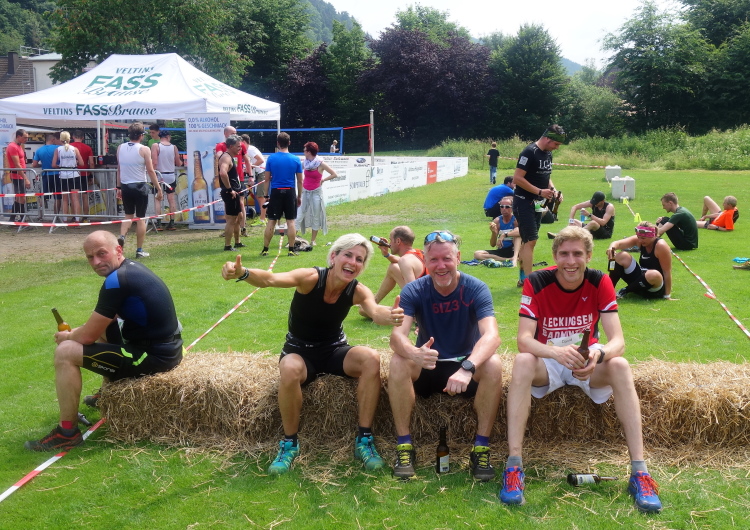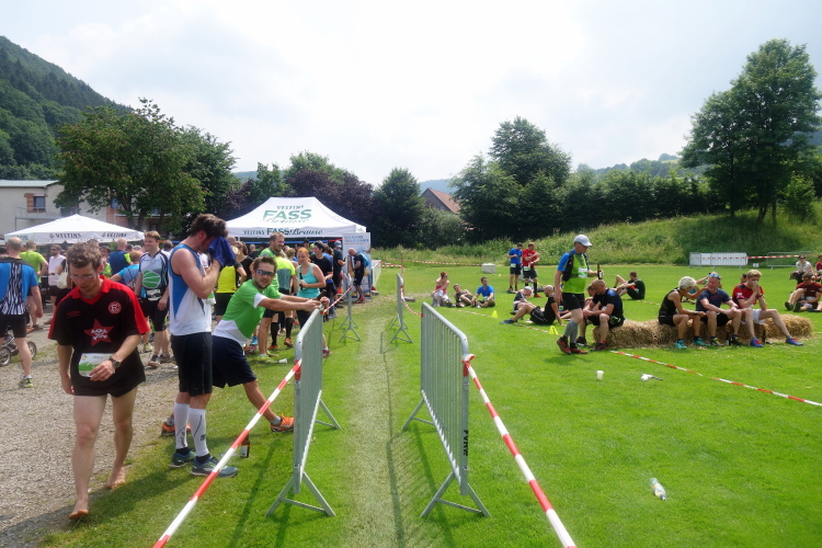 Im Ziel greife ich mir ein 0.0% Bier und setze mich auf einen Getreideballen. Und schwitze mehr, als ich nachfüllen kann. Also, raus aus der Sonne und aus dem Auto die Tasche holen, Shuttle zur Dusche (500m Fußweg) nehmen, im Duschcontainer am Schützenhaus erfrischeen, mit Shuttle zurück und weiter aktive Regeneration mit kühlen Getränken und Kuchen pflegen.
