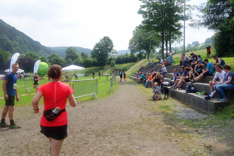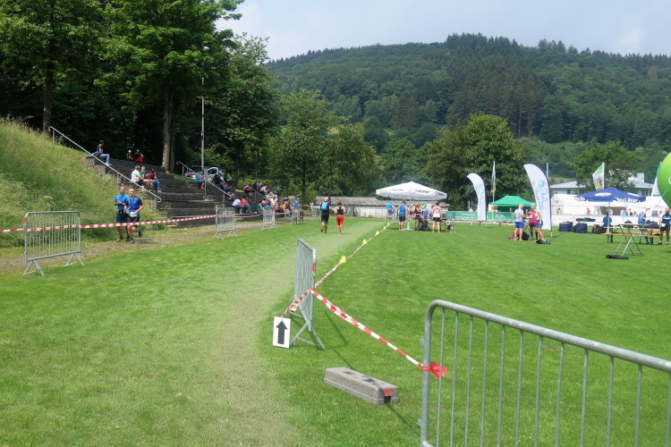 Hochmotiviert laufen ich abwärts und kommen auf die erste Steigung des Hinweges. Der Waldweg führt abwärts, rasch sind die Parkplätze am Start- und Zielgelände erreicht. Hinein geht es ins Stadion und unter dem Applaus der Zuschauer auf der Tribüne durch einen kleinen Tunnel und nach einer scharfen Wende direkt dahinter über den Rasen zum Ziel. Eine letzte Kurve ist noch zu laufen und ein wunderschöner Lauf ist zu Ende.