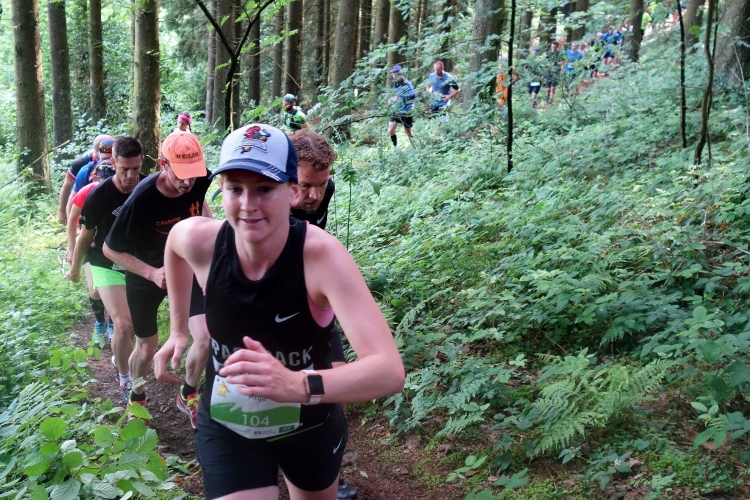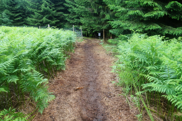 Endlich sind wir an der Abzweigung und biegen scharf rechts ab. Kurz drauf geht es links hoch hinein in das vom Hinweg bekannte Farnstück. Km 17 ist passiert, bald haben wir es geschafft. Ich denke an die Zielverpflegung und an eine kühle Dusche. Aber erst genieße ich noch die schönen Singletrail-Abschnitte. Der Lauf macht so richtig Spaß, auch wenn ich keuchen muss.