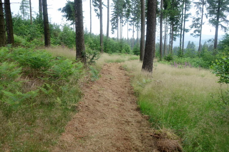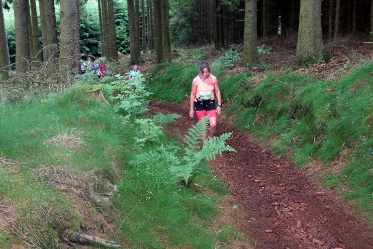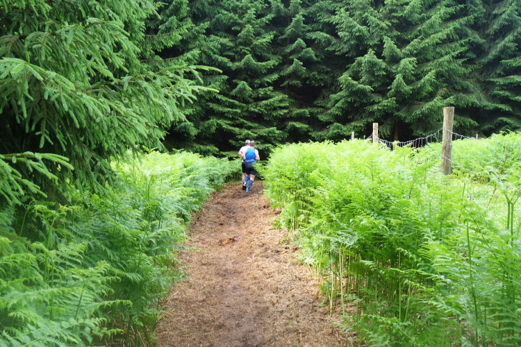 Nun sind wir Halben wieder unter uns. Eine Passage führt uns durch hohen Farn, aber über eine gemähte Schneise. Eine breite Waldautobahn nimmt uns auf. Wir kommen an zwei Streckenposten vorbei die uns anfeuern. Nachher werden wir aus der anderen Richtung wieder an diese Stelle kommen und in umgekehrter Richtung nach Hause laufen.