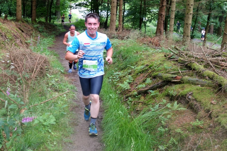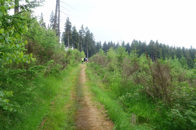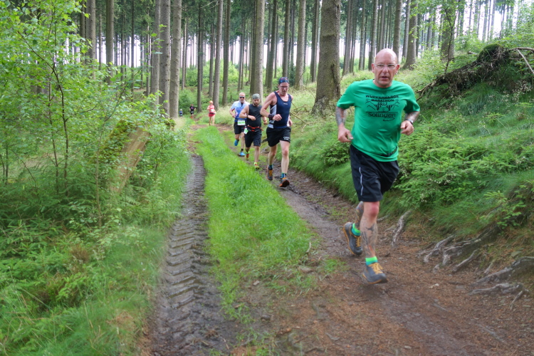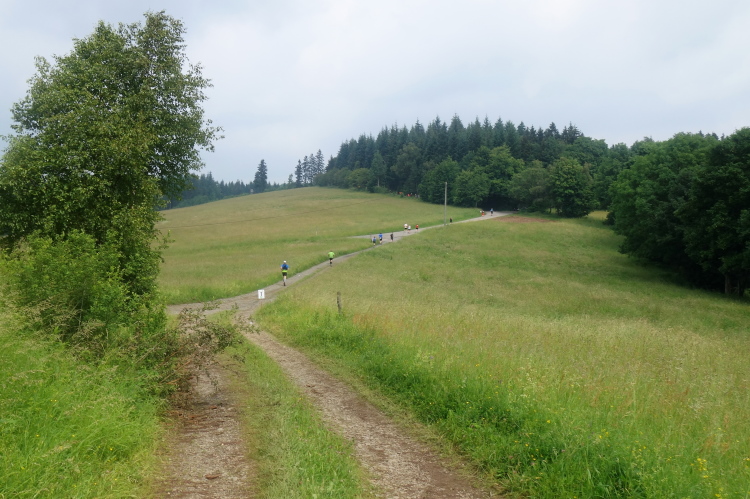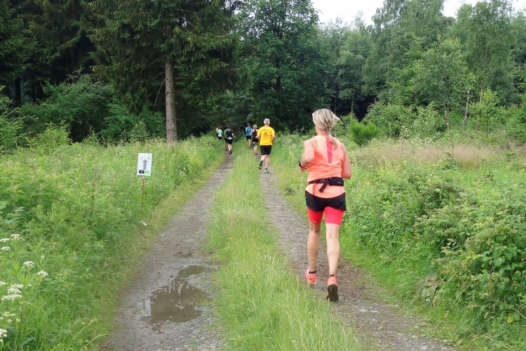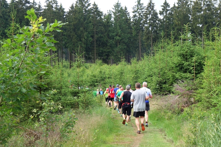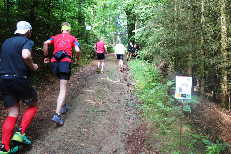 Nach Km 5 durchlaufen wir eine vom Orkan Kyrill vor Jahren geworfene Schneise. Ich höre überall nur zustimmende und begeisternde Stimmen von Läufern. Zitat: „Jetzt kommt mein Lieblingsstück“. Es sind viele Wiederholungstäter unterwegs.