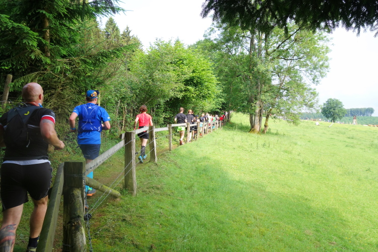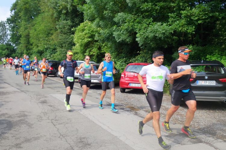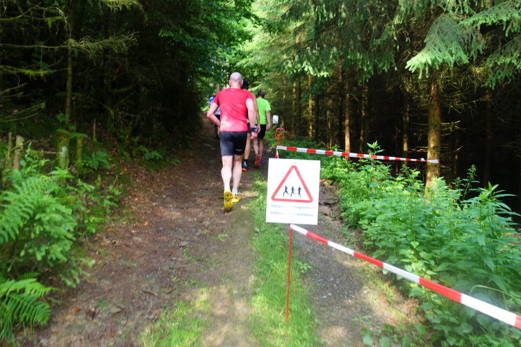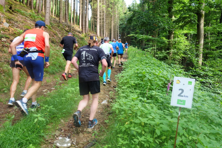 So mancher sieht hier sein Auto wieder. Den KFZ-Kennzeichen nach kommen die Läufer zum Teil von weither. Neben Kölnern sind auch Holländer zu sehen. Alle biegen nun links ab und verlassen den Asphalt. Auf einem Waldweg heißt es steigen. Angesichts der Schwüle fließt mir der Schweiß in Strömen. Ein Grund mehr, es gelassen angehen zu lassen.