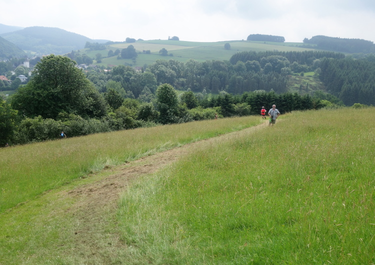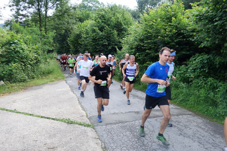 Plötzlich wir es laut hinter mir. Ein Fahrradfahrer fährt den ersten 10ern voraus und macht ihnen den Weg frei. Zwei schnelle Burschen ziehen an mir vorbei. Sie sind an den schwarzen Startnummern zu erkennen. Uns Halben ist das Sauerlandgrün vorbehalten.