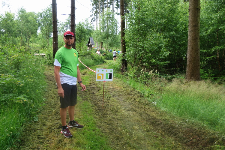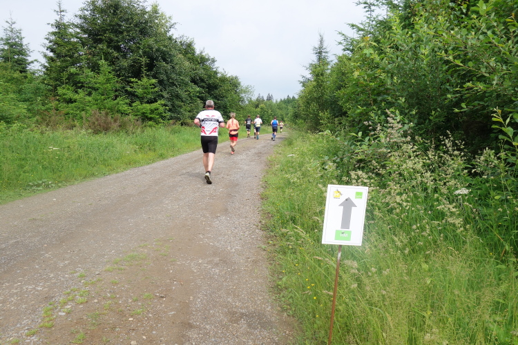 Eine Läuferin sagt vor dem 10 Km-Schild plötzlich: „Gib mir mal die Kamera“. Ich gehorche und so komme ich durch die nette Läuferin zu einem Foto. Wir sind immer noch auf der Forststraße. Eine weitere VS bietet Erquickung für die in der Schwüle schwitzenden Läufer. Wir biegen rechts ab auf einen schmaleren Waldweg. Und dann habe ich plötzlich keinen Läufer mehr vor mir. Nein, ich bin nicht Erster, das Läuferfeld hat sich so weit auseinander gezogen.