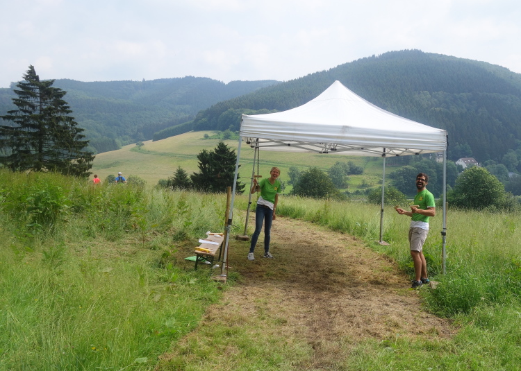 Einige Baumstämme müssen übersprungen werden und dann ist der Waldrand erreicht. Durch einen Pavillon geht es auf eine Wiese die uns steil abwärts führt. Zwei Streckenposten im Pavillon feuern uns an, nur noch ein Kilometer ins Ziel. Den Sprecher im Ziel können wir schon von hier oben hören.