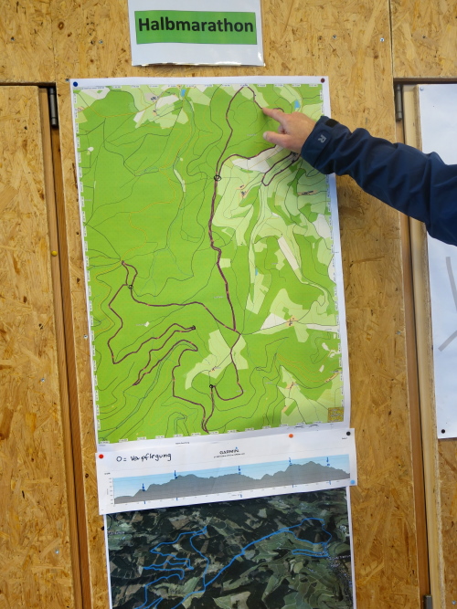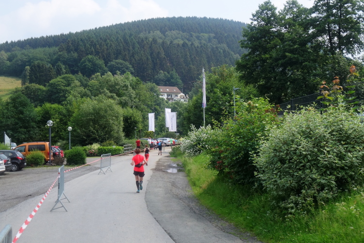 Pünktlich um 10 Uhr werden wir auf die Strecke gelassen. Mit dabei und ganz vorne am Start ist Tim Dally, der Vorjahressieger. Ich nehme es vorweg, er wird auch diesmal nicht zu schlagen sein. Vorne geht die Post ab, aber ich lasse es gemütlich angehen. Wir laufen aus dem Stadion und zunächst auf Straße aus dem Ort. Das wird aber das einzige Stück Asphalt für heute. Das Feld zieht sich auseinander. Wir machen eine Wende und laufen auf der anderen Talseite weiter auf Asphalt. Km 1 wird passiert. Vorbei geht es an den Parkplätzen neben dem Startbereich.