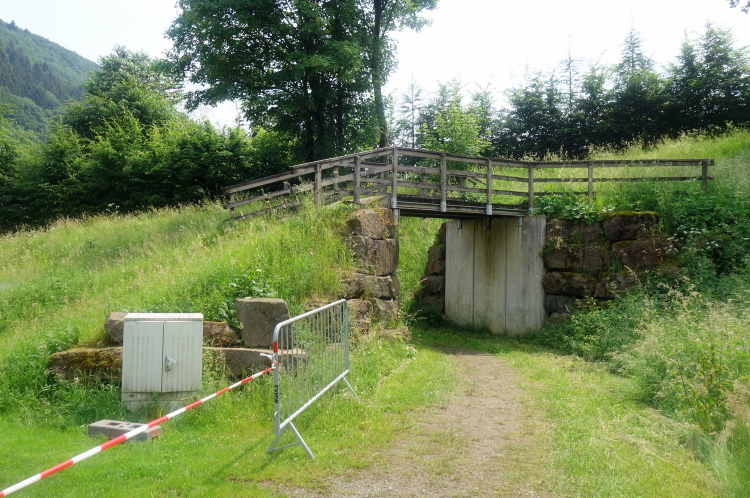 Wann kommt denn der Abzweig mit den zwei Streckenposten? Es geht einmal kurz hinaus aus dem Wald und rein in die Sonne. Den Unterschied merkt man sofort. Ich bin nur froh, dass wir heute zumeist im kühleren Wald laufen. Die Schwüle macht auch so genug zu schaffen.