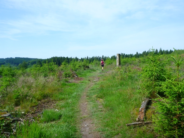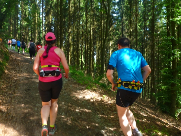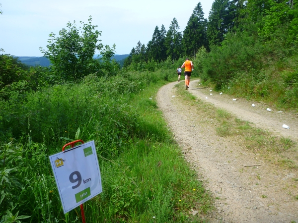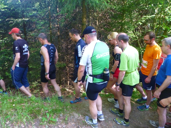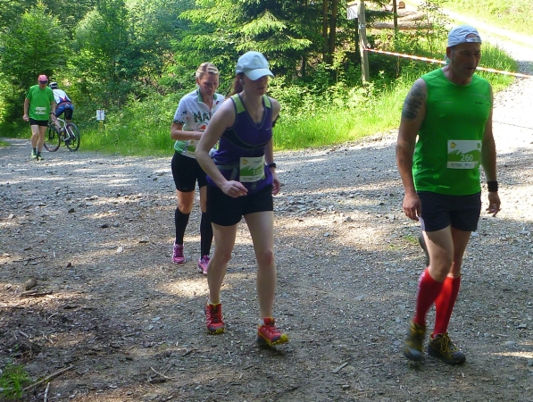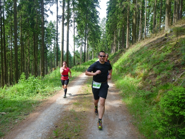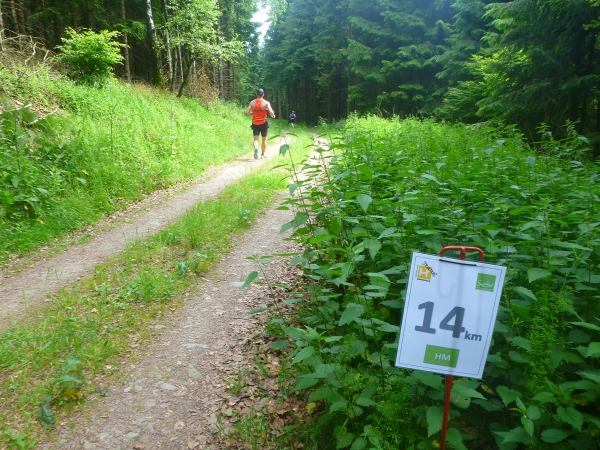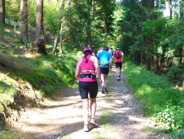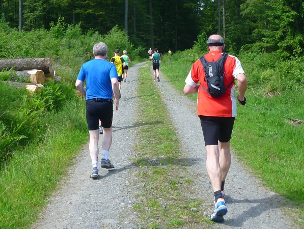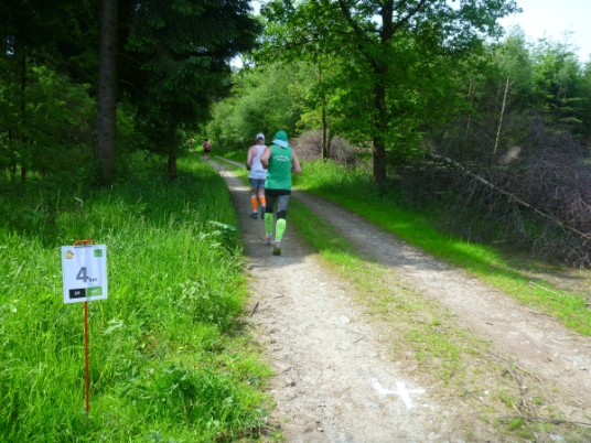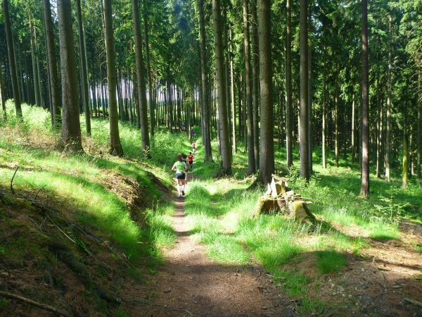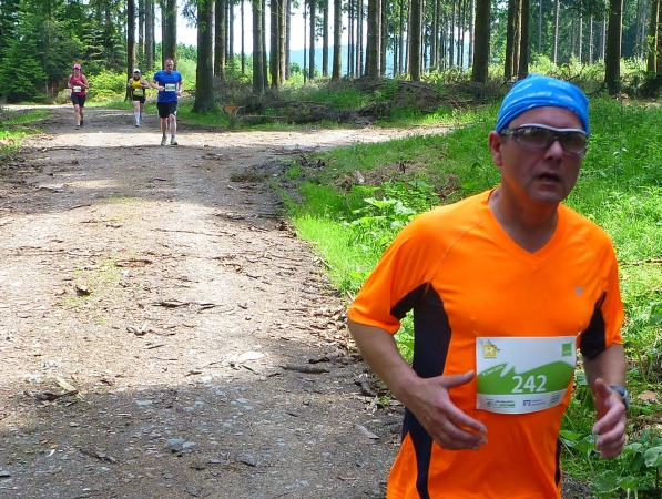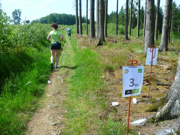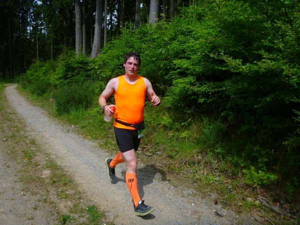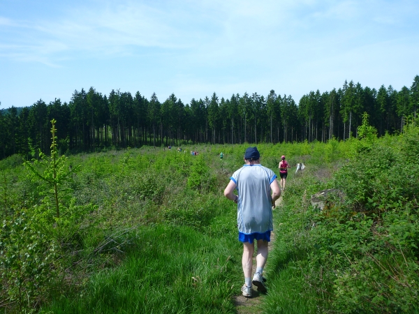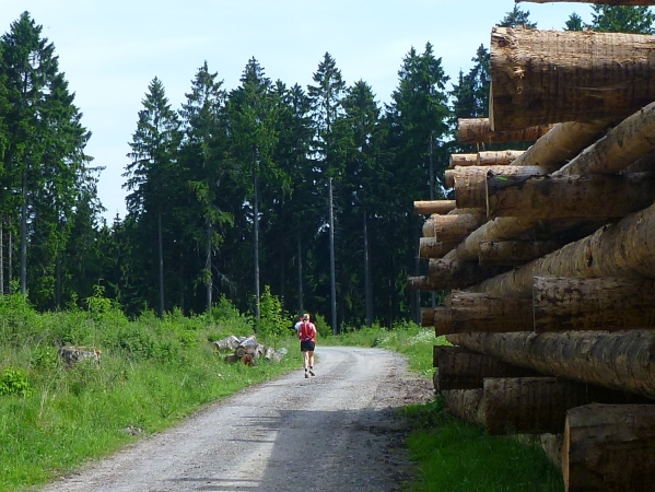 Breite Forstwege wechseln mit Single-Trails, Wald mit offenen Flächen (Kyrill-Brachen). Es bleibt abwechslungsreich. Einige Läufer fallen mir besonders ins Auge. Sie laufen in orangenen Shirts. Schaut aus wie bei einem Betriebsausflug der M4Y- und TR-Reporter. Es sind aber Mitglieder des Laufteams einer bekannten Brauerei.
