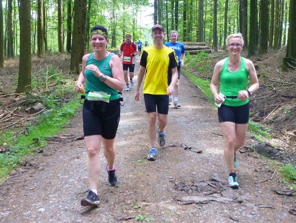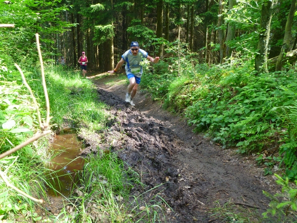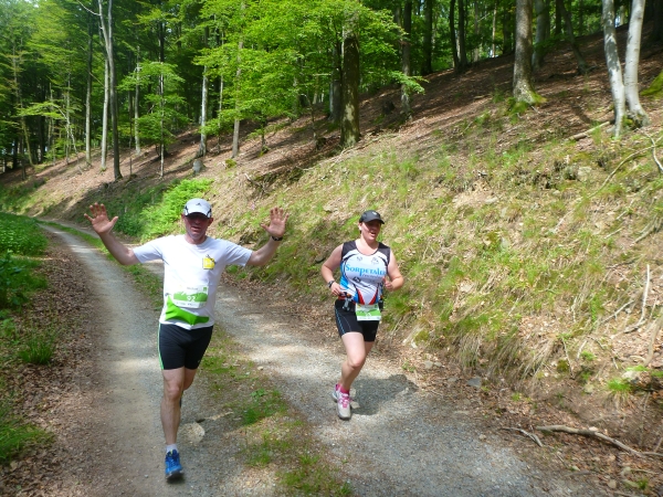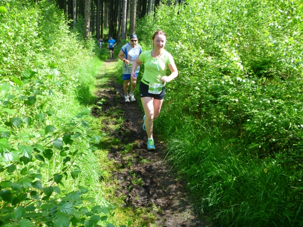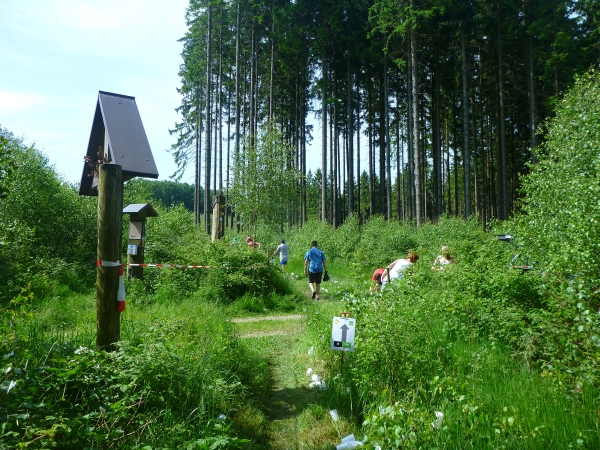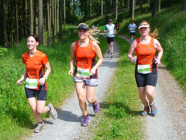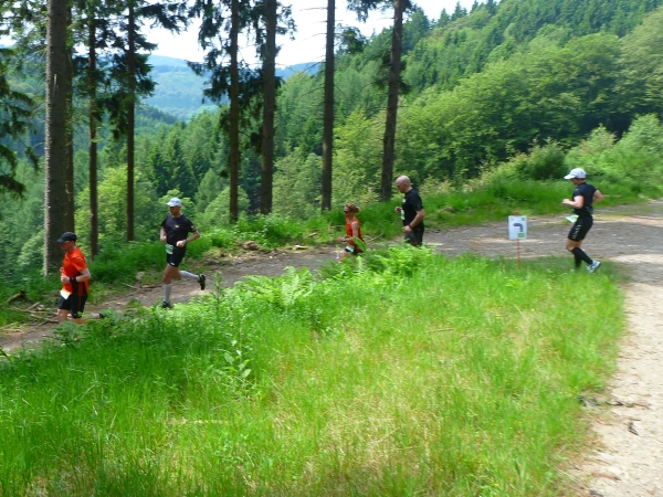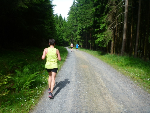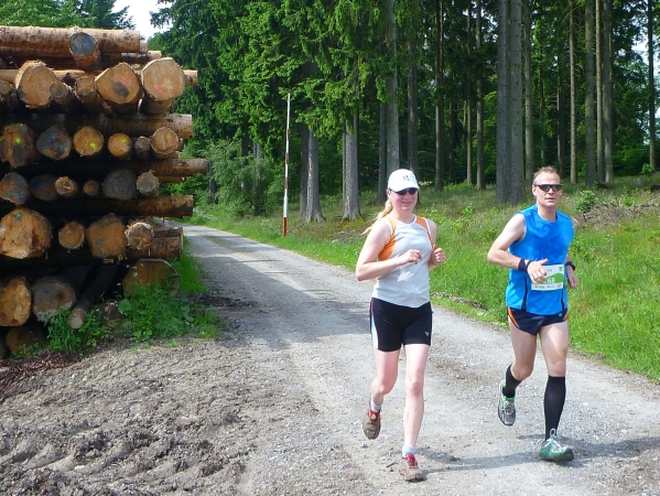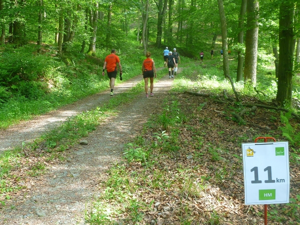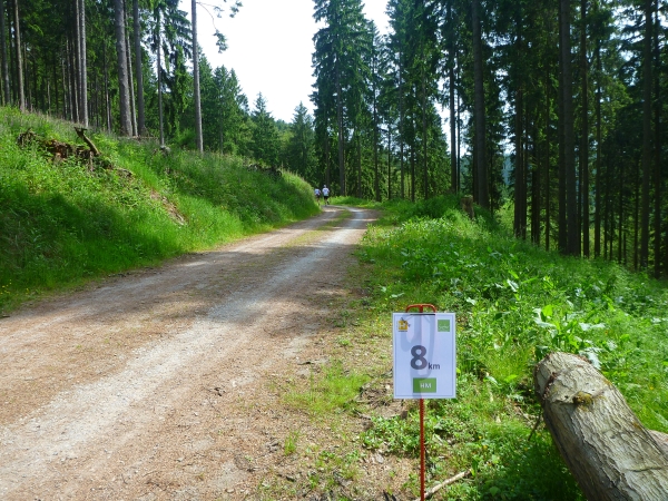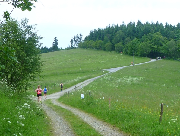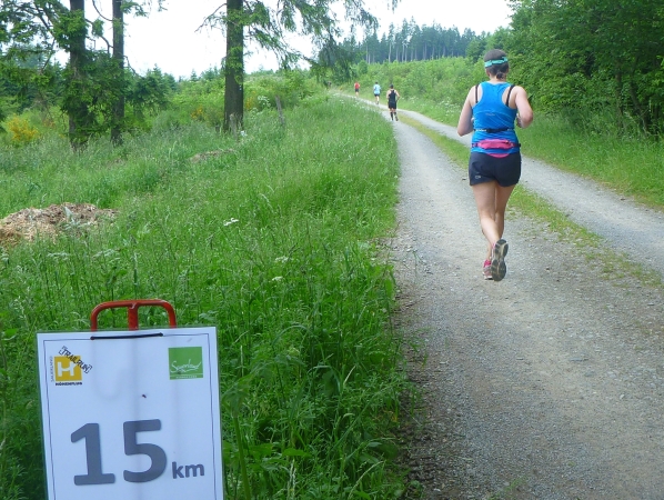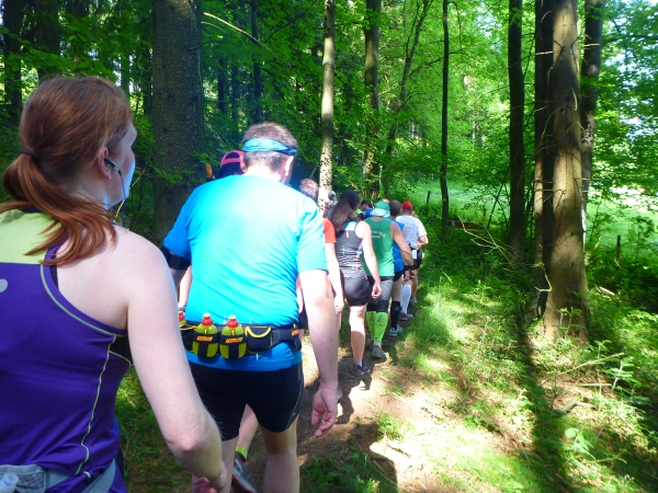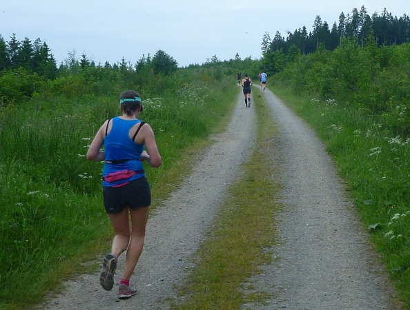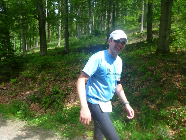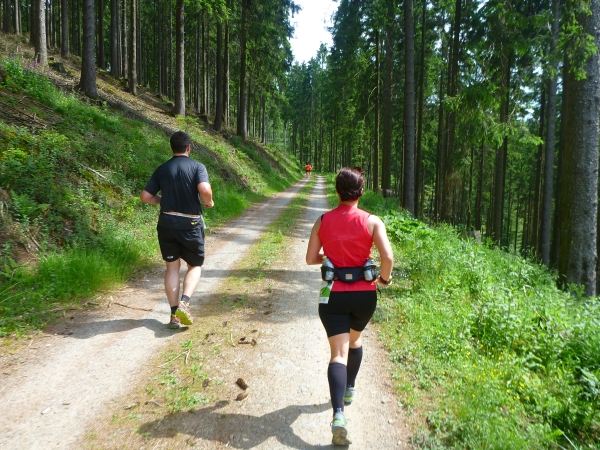 Breite Forstwege wechseln mit Single-Trails, Wald mit offenen Flächen (Kyrill-Brachen). Es bleibt abwechslungsreich. Einige Läufer fallen mir besonders ins Auge. Sie laufen in orangenen Shirts. Schaut aus wie bei einem Betriebsausflug der M4Y- und TR-Reporter. Es sind aber Mitglieder des Laufteams einer bekannten Brauerei.