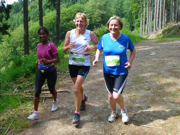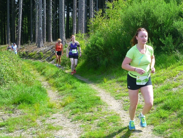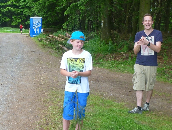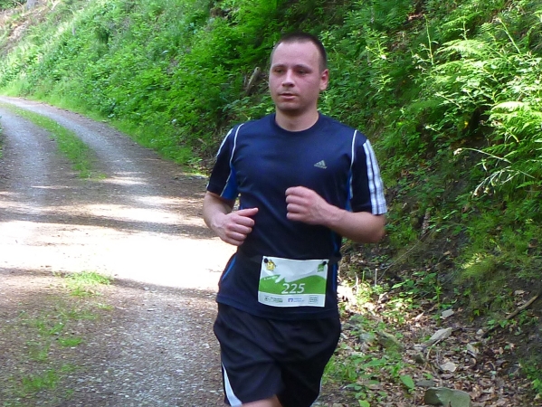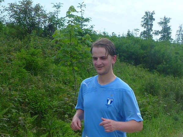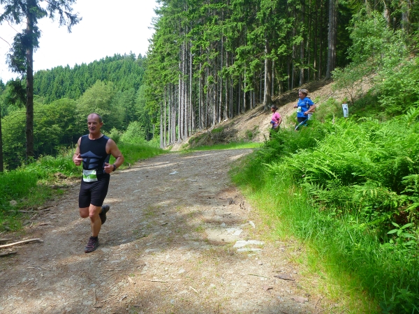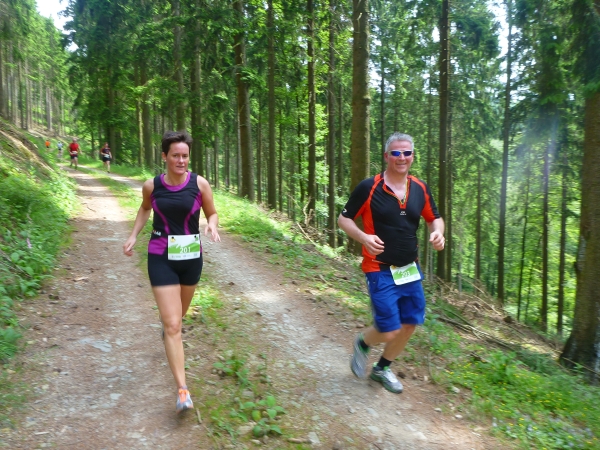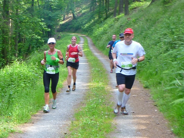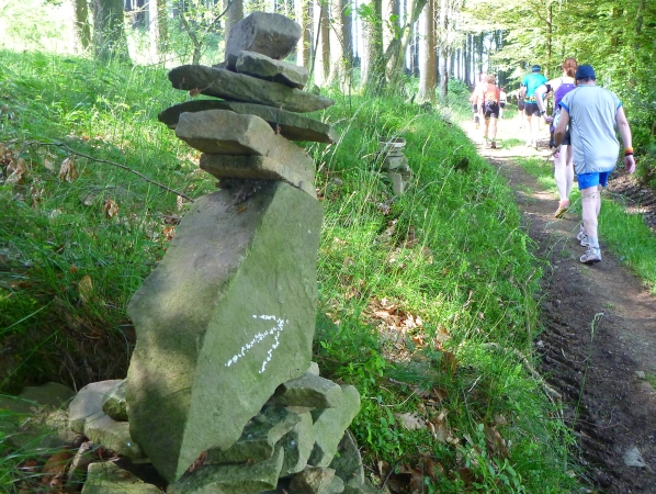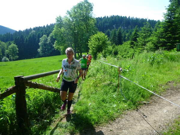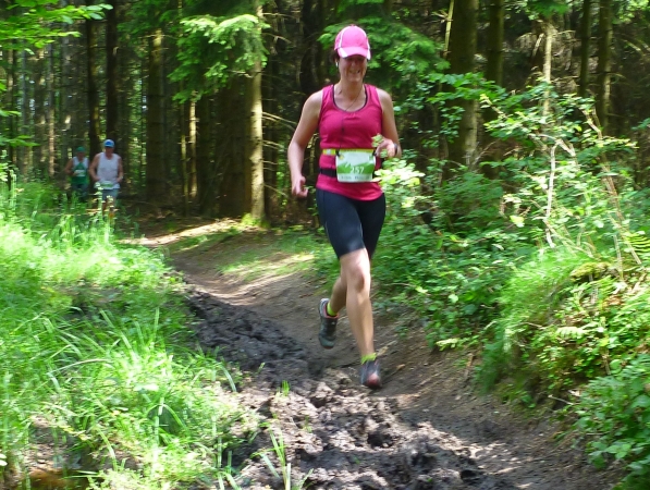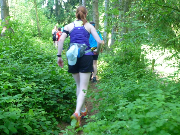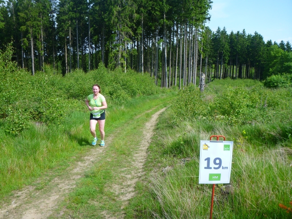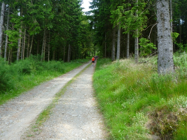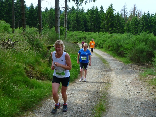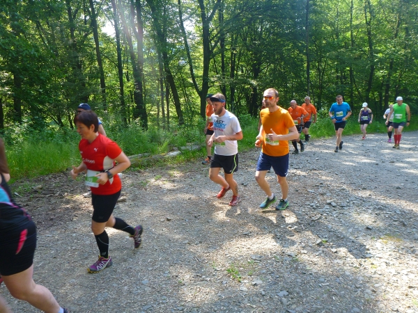 Breite Forstwege wechseln mit Single-Trails, Wald mit offenen Flächen (Kyrill-Brachen). Es bleibt abwechslungsreich. Einige Läufer fallen mir besonders ins Auge. Sie laufen in orangenen Shirts. Schaut aus wie bei einem Betriebsausflug der M4Y- und TR-Reporter. Es sind aber Mitglieder des Laufteams einer bekannten Brauerei.