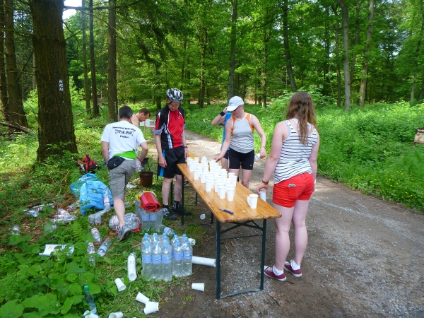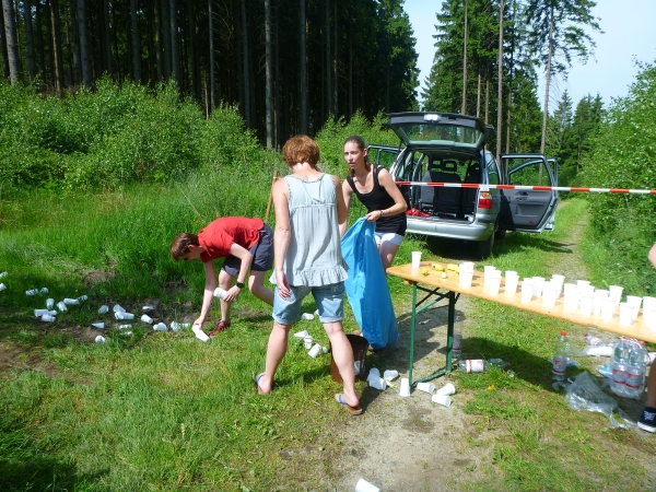 Damit kein Müll in Form von Trinkbechern im Wald zurückbleibt, sind fleißige Hände direkt mit dem Aufsammeln der Becher beschäftigt.