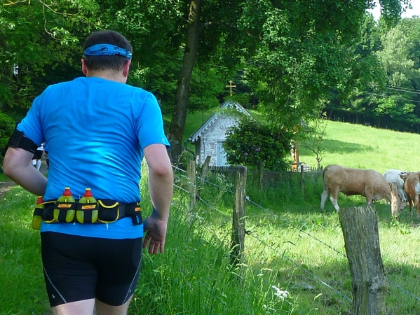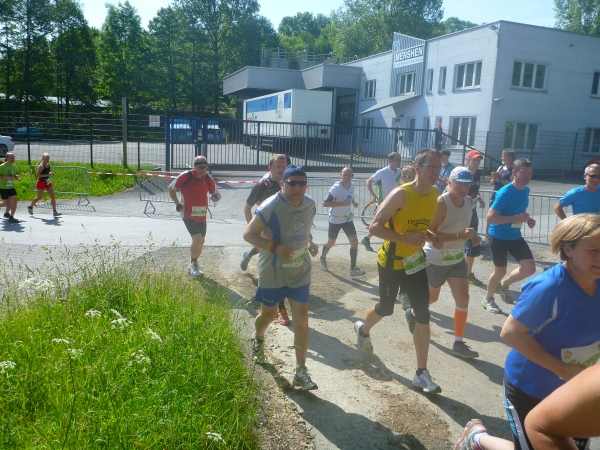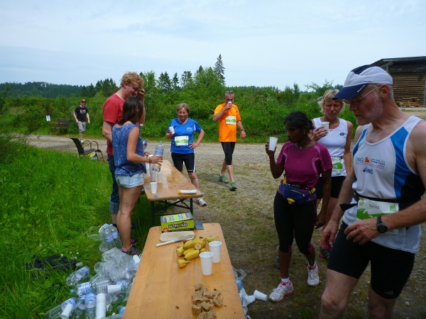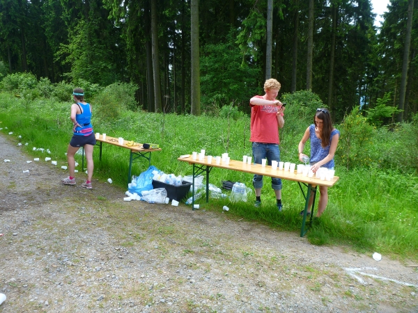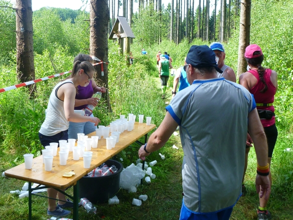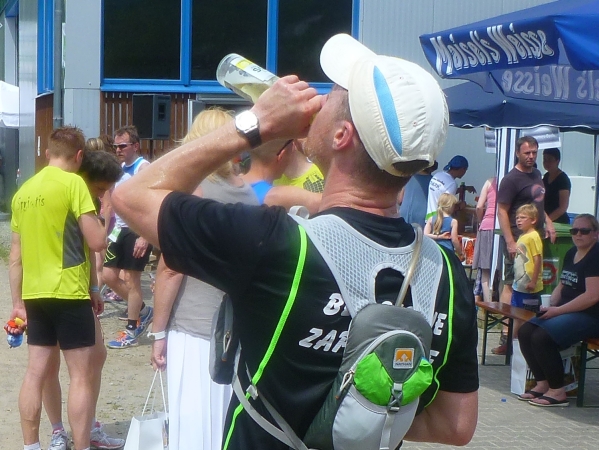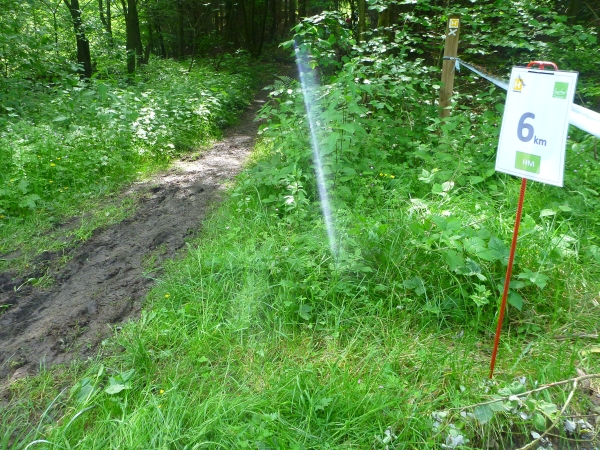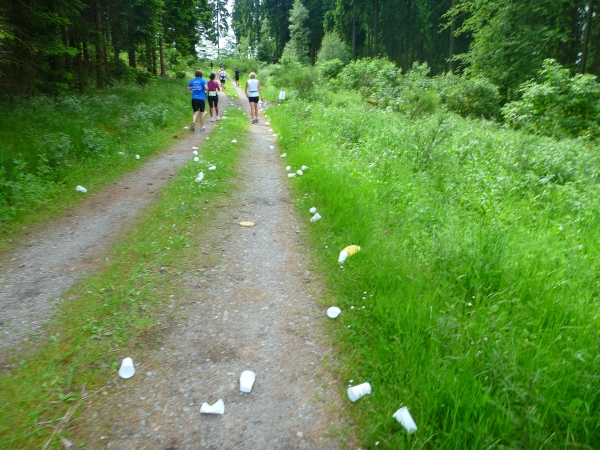 Nach 3 Km kommt schon die erste Verpflegungsstelle. An dieser Stelle sei dem Veranstalter ein dickes Lob ausgesprochen. Angesichts der hohen Temperaturen wurden kurzfristig zwei zusätzliche VS eingerichtet, so dass uns alle drei Km eine VS erwartet. Das nenne ich läuferfreundlichen Service.