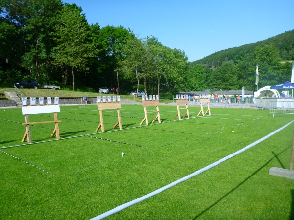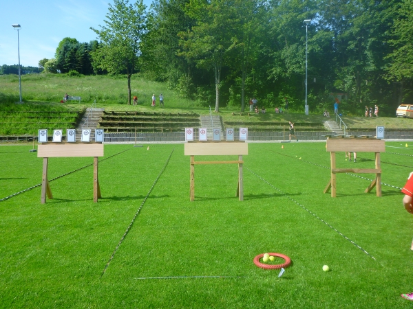 Auf dem Rasen ist ein Biathlonschießstand aufgebaut. Zum Glück für uns Läufer wird beim Schülerbiathlon nicht mit scharfer Munition geschossen. Es wird mit Tennisbällen geworfen.