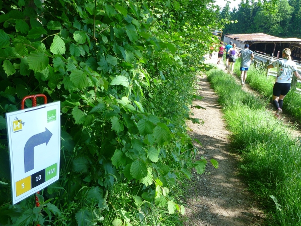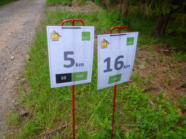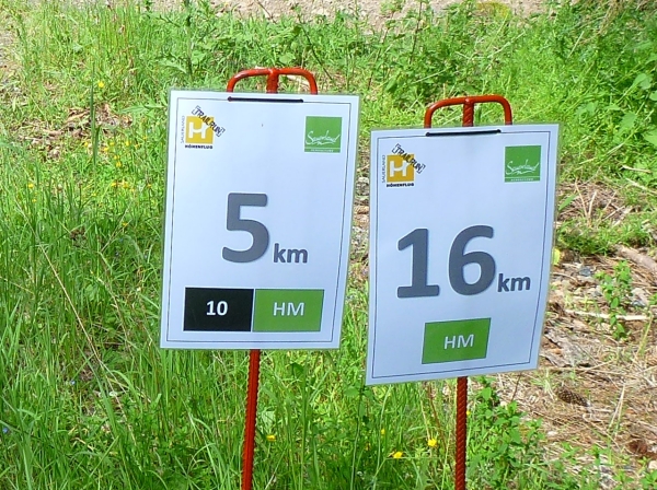 Alles ist bestens ausgeschildert, Verlaufen unmöglich. Anfangs gelten die weißen Hinweisschildern auch für 5er und 10er. Auf Gelb und Schwarz steht in weißer Schrift die Km-Angabe 5 bzw. 10 auf dem Zeichen neben dem Grün für HM. Später gelten die Hinweisschilder nur für den grünen HM.