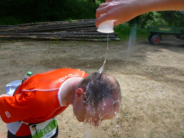 An der nächsten VS wird mir ein besonderer Service zuteil. Ein freundlicher Helfer bietet mir den Inhalt eines Wasserbechers auf zwei Meter Entfernung an und schickt das Wasser auf den Weg zu mir. Leider hat er mich nicht getroffen. Ich bin heute für jede Erfrischung dankbar. Daher lasse ich mir Wasser über den Kopf schütten. Herrlich, die Erfrischung. Mit (ge)kühl(t)em Kopf läuft es sich doch gleich besser.