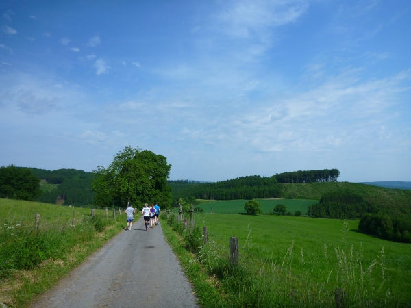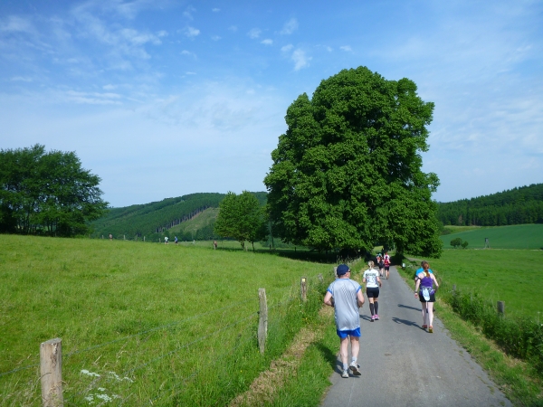 Der Trail ist Klasse. Einfach schön hier zu laufen, so ganz nach meinem Geschmack. Und er ist abwechslungsreich. Immer wieder kommen wir aus dem Wald hinaus und können schöne Ausblicke auf die Landschaft des Sauerlandes genießen.