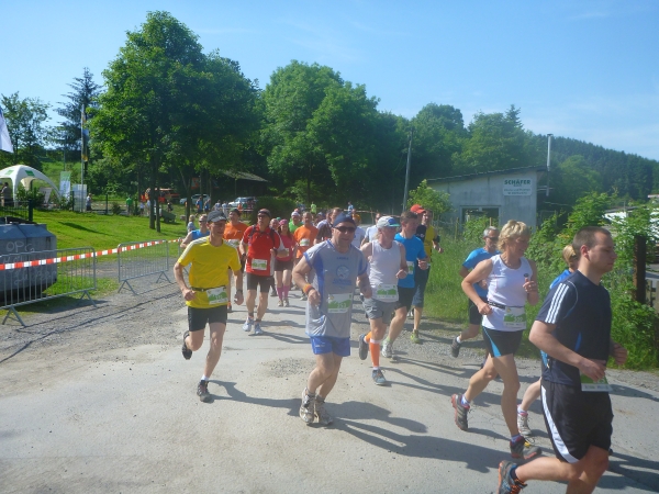 Petrus meint es heute sehr gut mit uns. Die Sonne lacht vom Himmel, es ist eine Pracht. Es ist 10.10 Uhr und pünktlich werden wir ohne viel Drum-Herum auf die Strecke geschickt. Der 1. Sauerland-Höhenflug-Trail startet. In der ersten Kurve stehen Zuschauer, die uns mit viel Applaus auf die Strecke schicken.