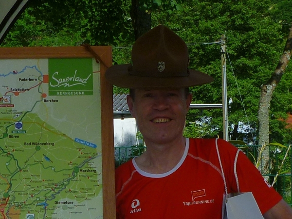 Es ist ein herrlicher Tag. Die Sonne sticht vom Himmel. Es ist schon am Morgen lecker warm. Ich schlendere zur Halle und bekomme ohne große Wartezeit meine Startunterlagen. Im Starterbeutel ist auch ein kleines grünes "Sauerland Täschken" mit Info zum Sauerland und dem Höhenflug Wanderweg. Infos zum Sauerland gibt es auch bei einem Stand, an dem ich es nicht lassen kann, mir einen Rangerhut aufzusetzen.