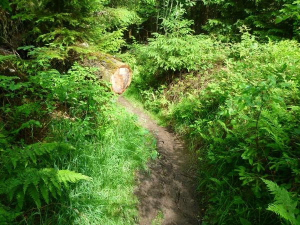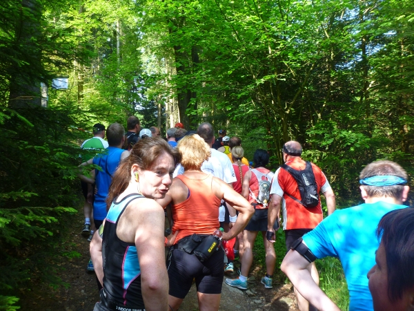 Wie vor dem Start angekündigt, kommt bald ein Single-Trail. Hier heißt es einen Moment warten. Es bildet sich ein Mini-Stau beim Verlassen der Forststraße und dem Einbiegen auf den schmalen Pfad.