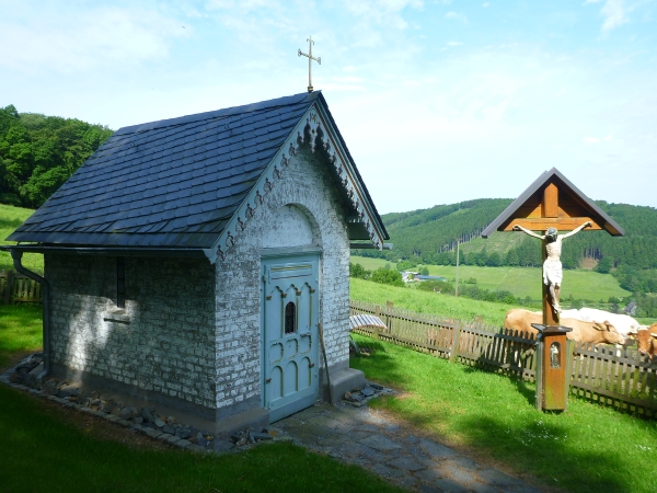 Wir laufen einige Meter über einen asphaltierten Wirtschaftsweg. An einem großen Baum biegen wir scharf links ab. Rechts von uns grasen neben einer kleinen Kapelle friedlich Kühe. Ein Idyll.