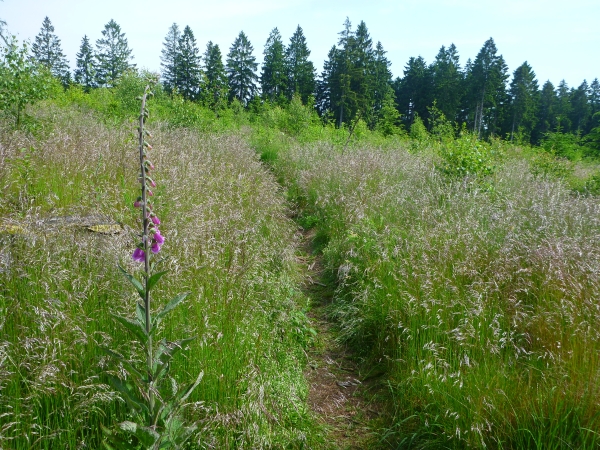 Ein Foto mache ich aber noch auf der Strecke. Wir können das Ziel unten im Tal schon sehen, da steht ein weißer Pavillon beim Übergang auf eine Wiese. Er markiert den letzten zu laufenden Kilometer, sozusagen der Teufelslappen beim Höhenflug-Trail. Im Zickzack werden wir über die Wiese abwärts geführt Richtung Ziel.