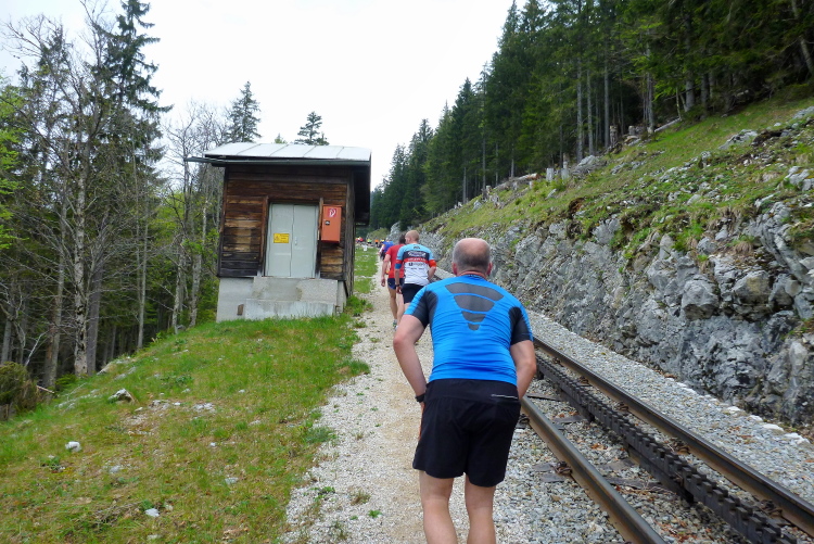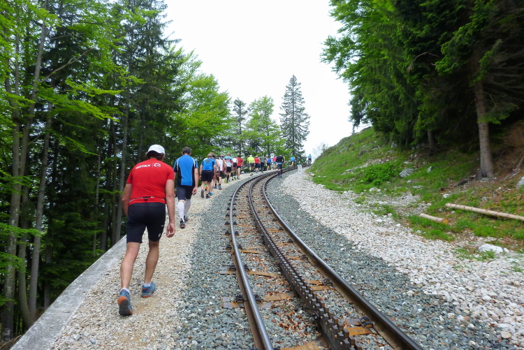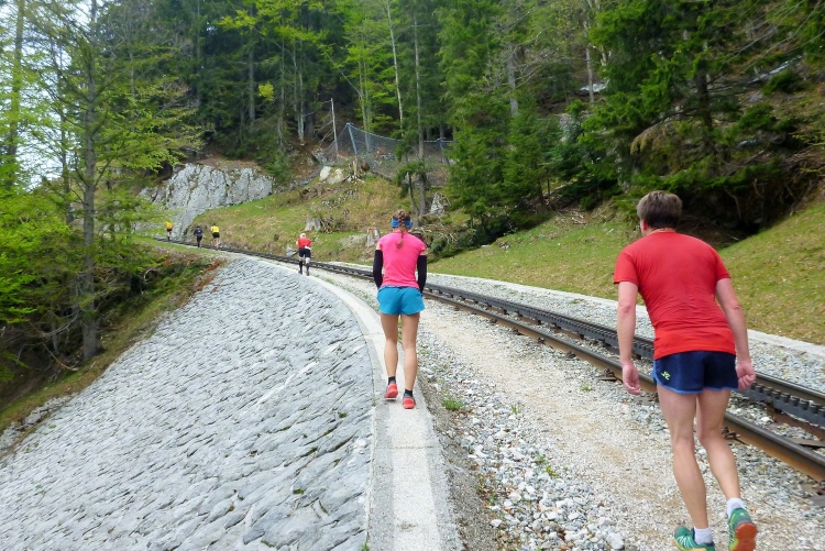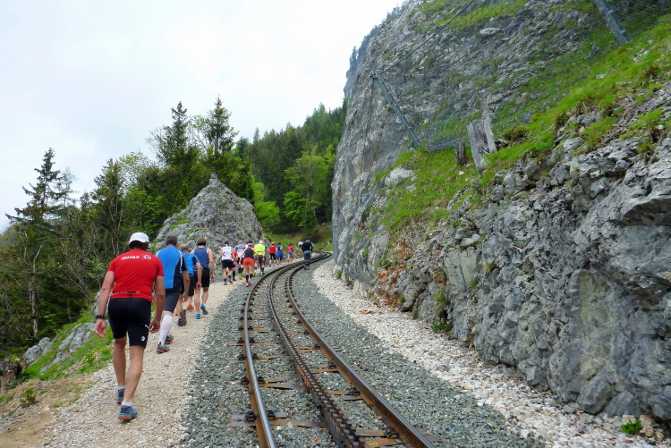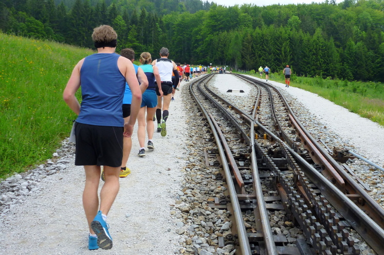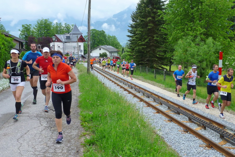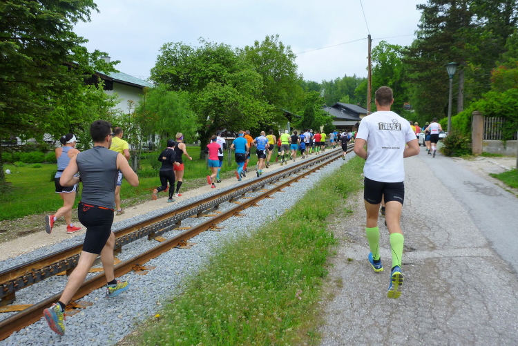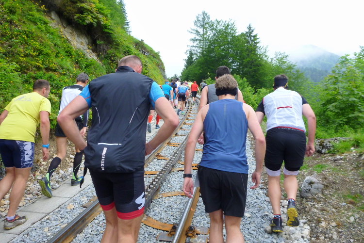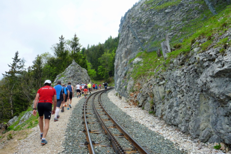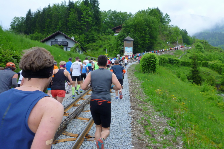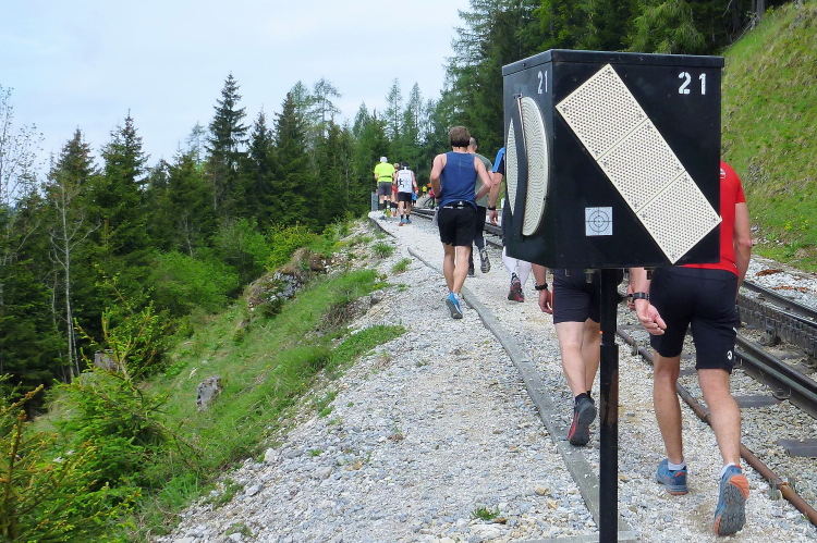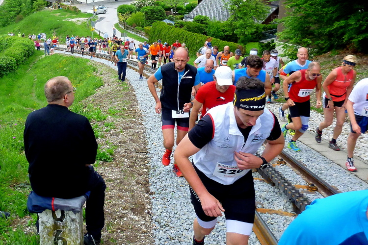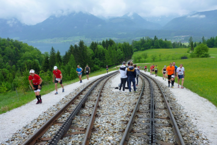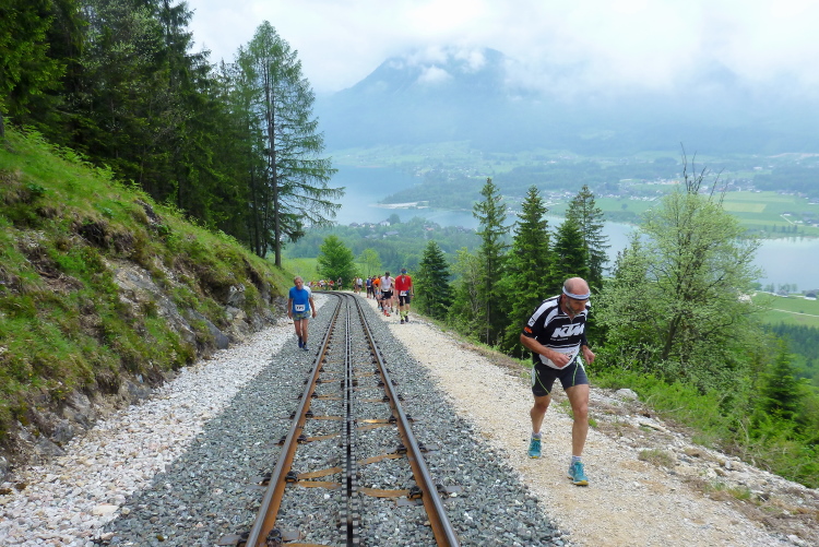 Rechts der Schienen liegt grober Schotter, auf ihm zu laufen ist keine gute Idee. Links auf der schmalen Abdeckung der Kabelstränge geht's dagegen deutlich besser. Die Folge ist ein Läuferlindwurm wie auf schmalen Bergpfaden, das Überholen jedes Mal ein Kraftakt. Doch dieses Problem wird sich schon bald erledigt haben, Positionskämpfe gibt es in meiner Preisklasse kaum. Jeder ist mit sich selbst und der Steigung hinreichend beschäftigt. Feiner Schotter beiderseits der Ausweiche erleichtert das Vorwärtskommen und ein Übriges leisten kleine Fangruppen, die immer wieder anfeuernd an den Schienen stehen. Wer den Blick auch mal nach links schweifen lässt, erkennt zwischen den Bäumen den mit steigender Höhe kleiner werdenden Wolfgangsee, ein wunderbarer Anblick.