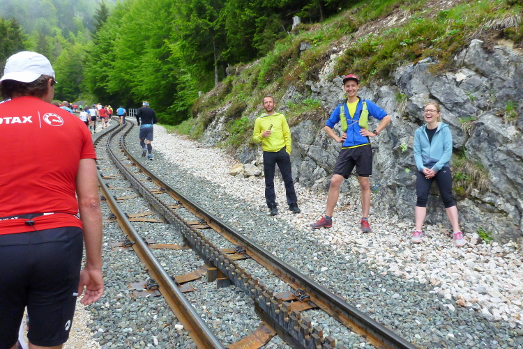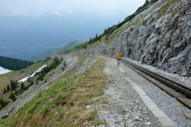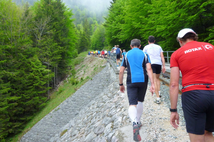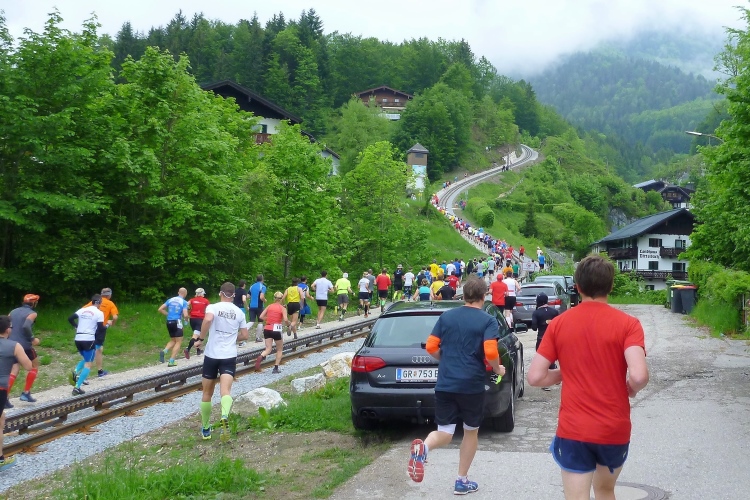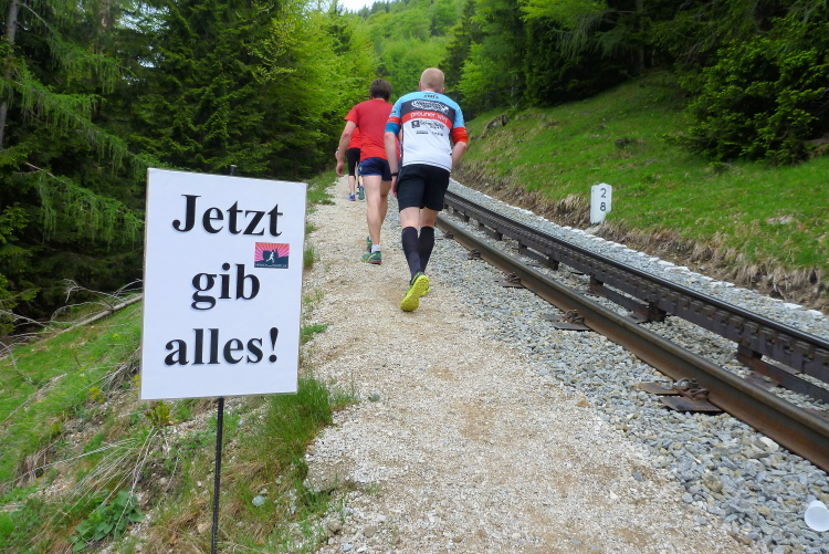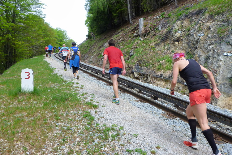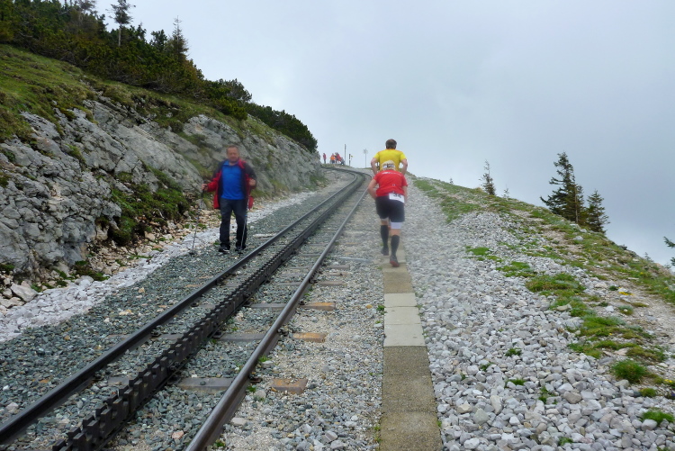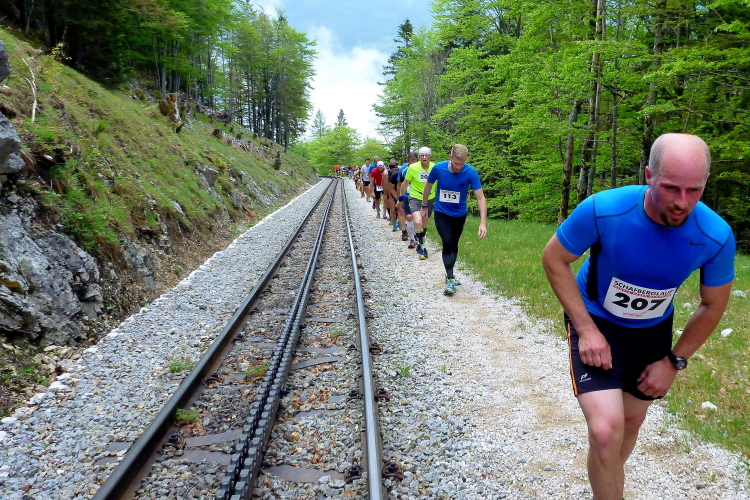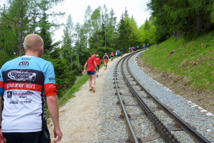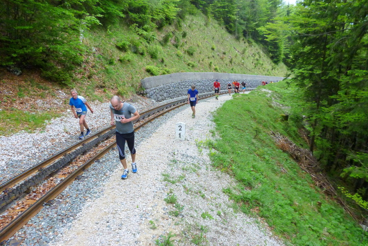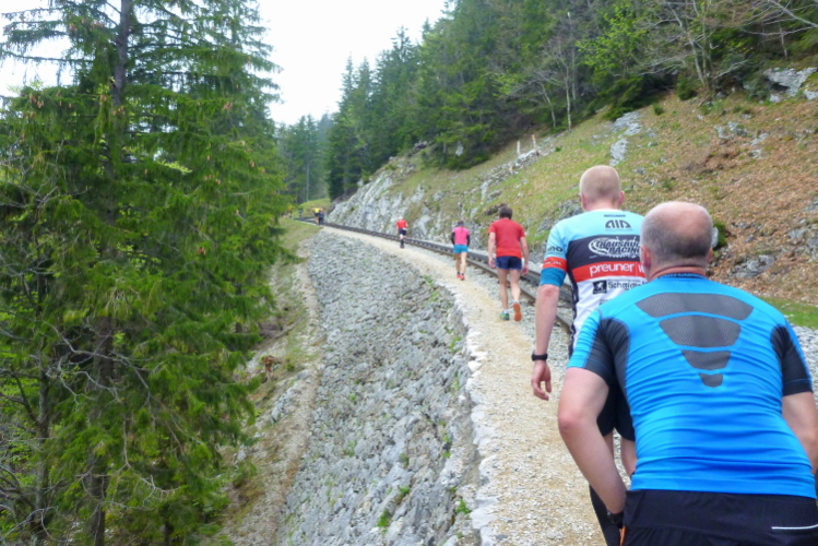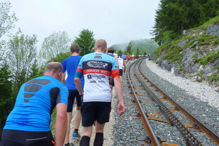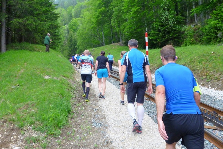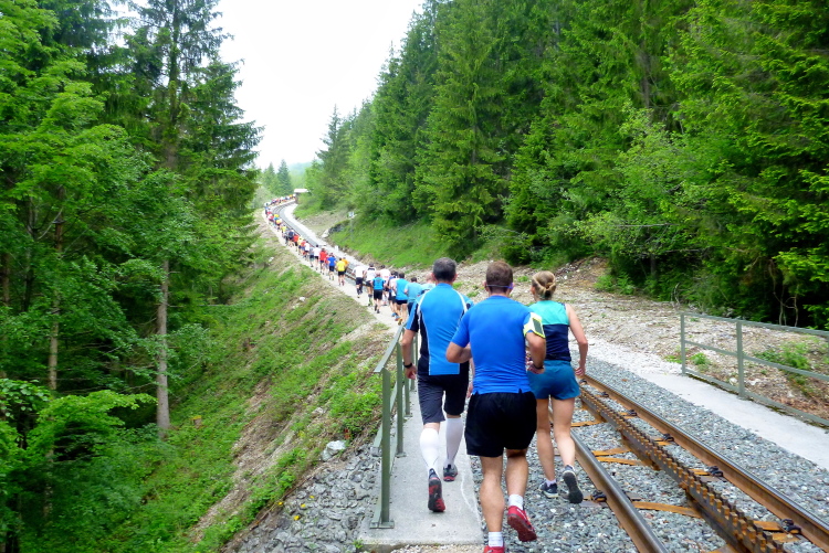 Rechts der Schienen liegt grober Schotter, auf ihm zu laufen ist keine gute Idee. Links auf der schmalen Abdeckung der Kabelstränge geht's dagegen deutlich besser. Die Folge ist ein Läuferlindwurm wie auf schmalen Bergpfaden, das Überholen jedes Mal ein Kraftakt. Doch dieses Problem wird sich schon bald erledigt haben, Positionskämpfe gibt es in meiner Preisklasse kaum. Jeder ist mit sich selbst und der Steigung hinreichend beschäftigt. Feiner Schotter beiderseits der Ausweiche erleichtert das Vorwärtskommen und ein Übriges leisten kleine Fangruppen, die immer wieder anfeuernd an den Schienen stehen. Wer den Blick auch mal nach links schweifen lässt, erkennt zwischen den Bäumen den mit steigender Höhe kleiner werdenden Wolfgangsee, ein wunderbarer Anblick.