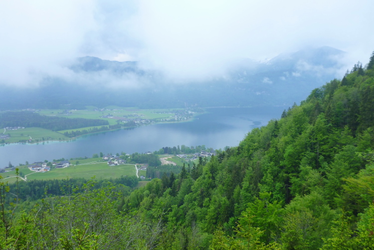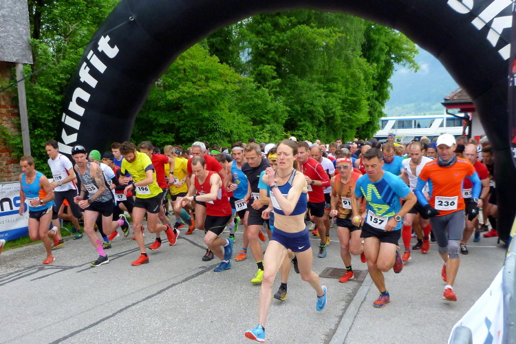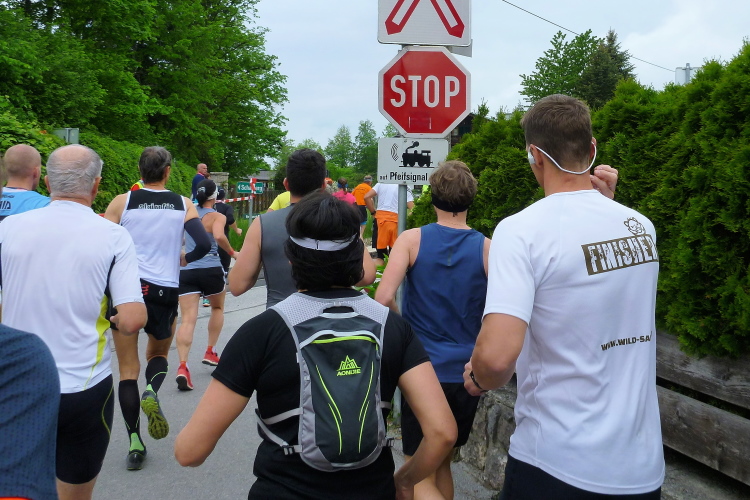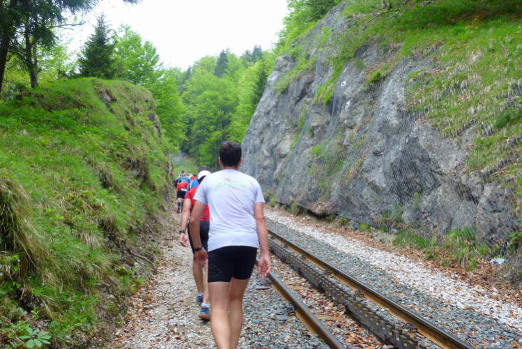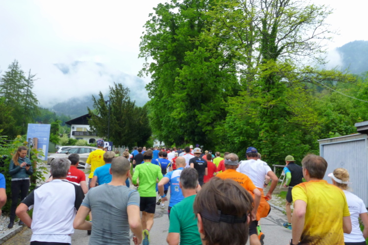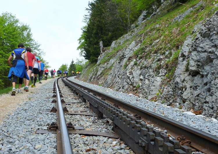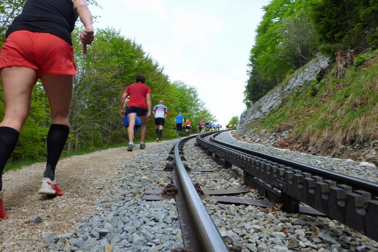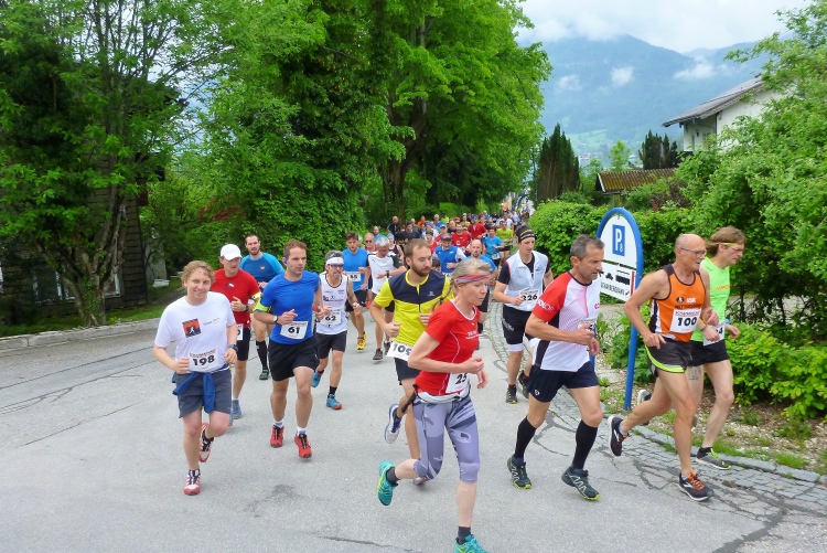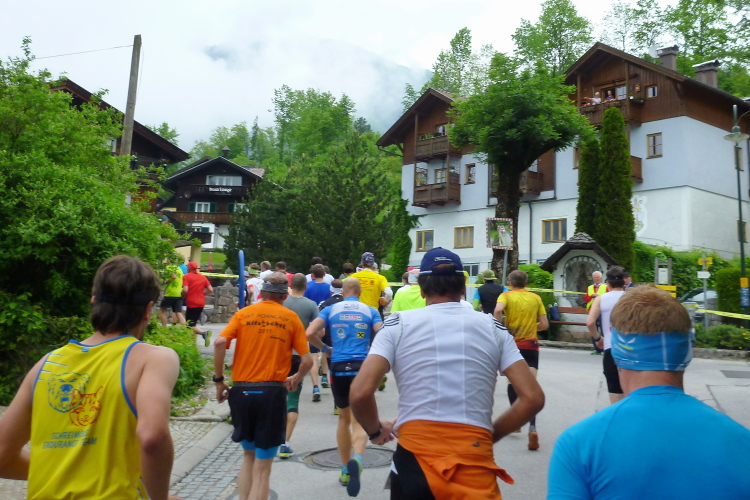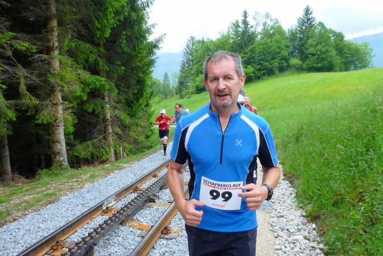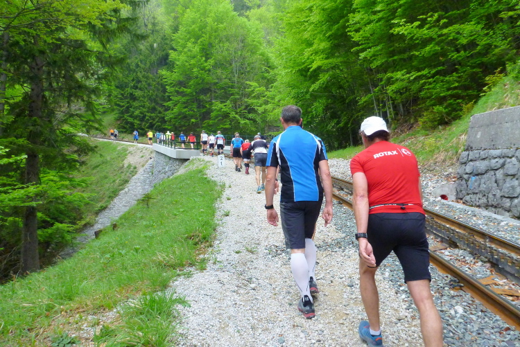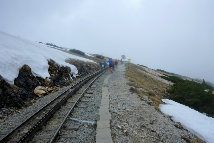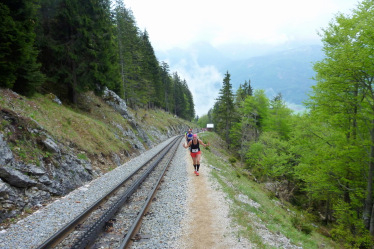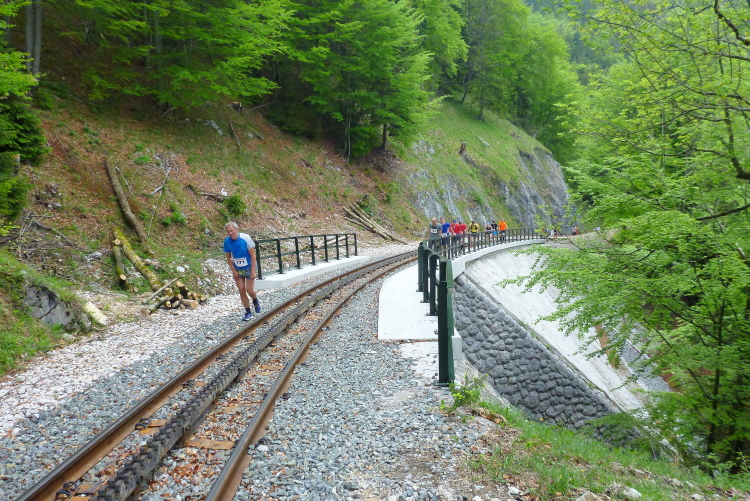 Rechts der Schienen liegt grober Schotter, auf ihm zu laufen ist keine gute Idee. Links auf der schmalen Abdeckung der Kabelstränge geht's dagegen deutlich besser. Die Folge ist ein Läuferlindwurm wie auf schmalen Bergpfaden, das Überholen jedes Mal ein Kraftakt. Doch dieses Problem wird sich schon bald erledigt haben, Positionskämpfe gibt es in meiner Preisklasse kaum. Jeder ist mit sich selbst und der Steigung hinreichend beschäftigt. Feiner Schotter beiderseits der Ausweiche erleichtert das Vorwärtskommen und ein Übriges leisten kleine Fangruppen, die immer wieder anfeuernd an den Schienen stehen. Wer den Blick auch mal nach links schweifen lässt, erkennt zwischen den Bäumen den mit steigender Höhe kleiner werdenden Wolfgangsee, ein wunderbarer Anblick.