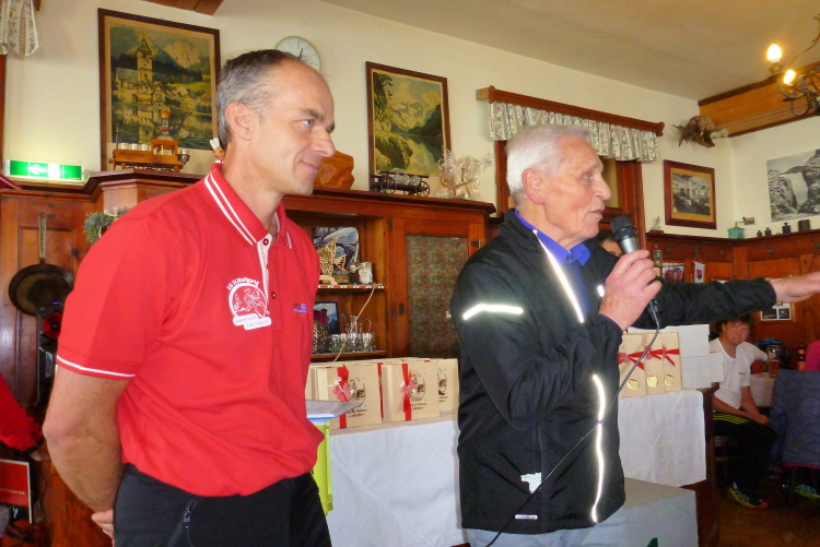 Während wir es uns in der gleichermaßen gut gefüllten wie geheizten Gaststube gut gehen lassen (Duschmöglichkeiten gab es im Obergeschoß), warten wir auf die Siegerehrung. Diese verläuft lange, aber trotzdem kurzweilig. Nach einigen lustigen Anekdötchen des ehemaligen Organisationschefs Franz Zimmermann werden alle Podestplätze auch mit schönen Präsenten belohnt. Andrea hat zum fünften Mal hintereinander alle hinter sich gelassen, aber leider dreizehn Sekunden zu lange gebraucht, um die virtuelle Dampflok zu schlagen. 47:13 min. brauchte der Männersieger, Daniel Rohringer. Insgesamt blieben 4 Mädels und 44 Jungs unter der Stundenmarke, der Kampf Mensch gegen Dampflok endete also 0 zu 226.