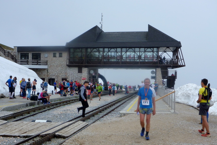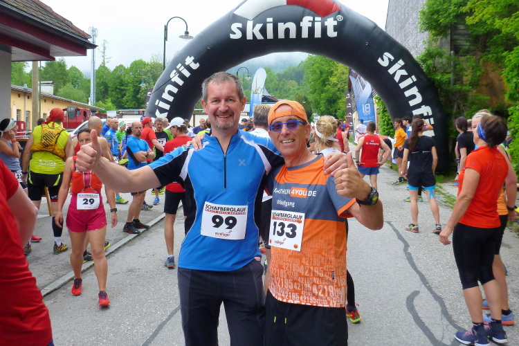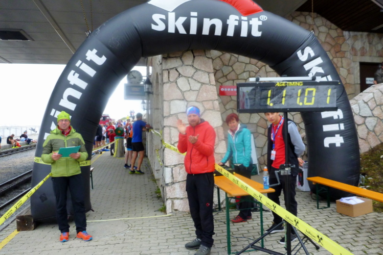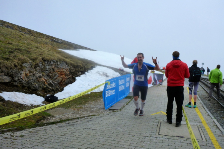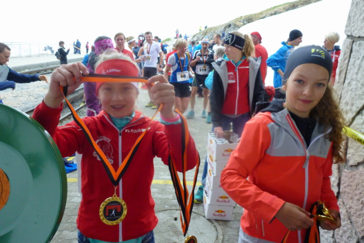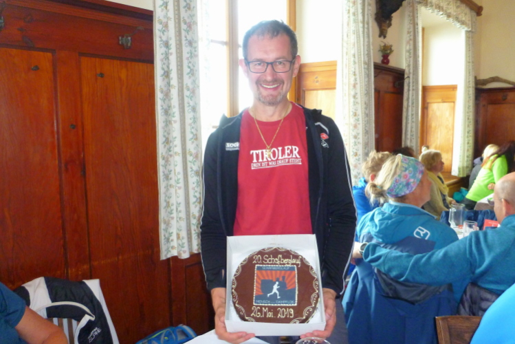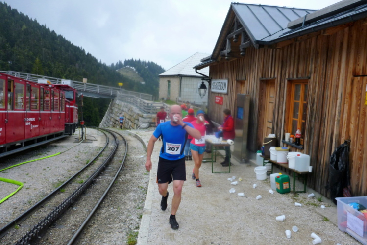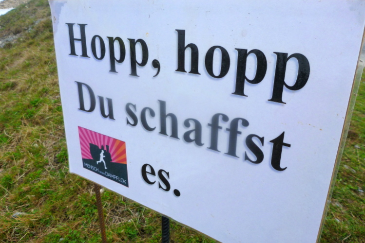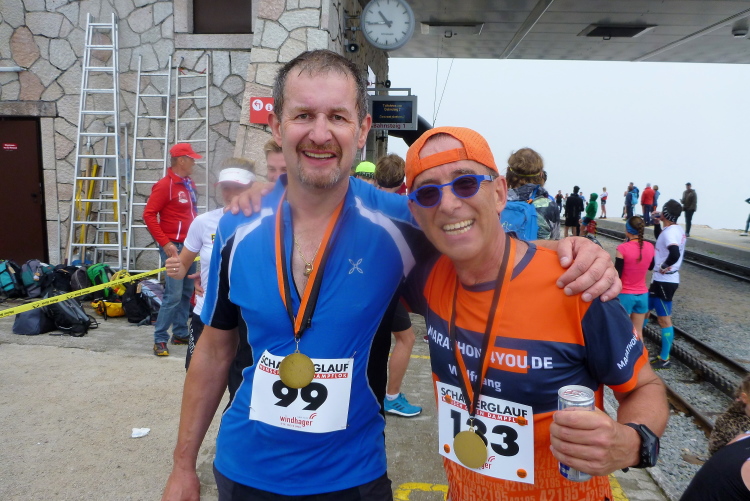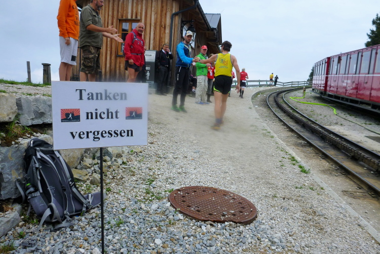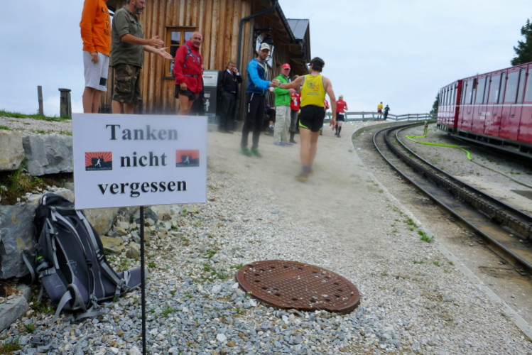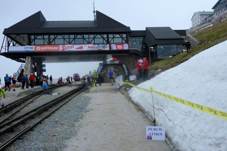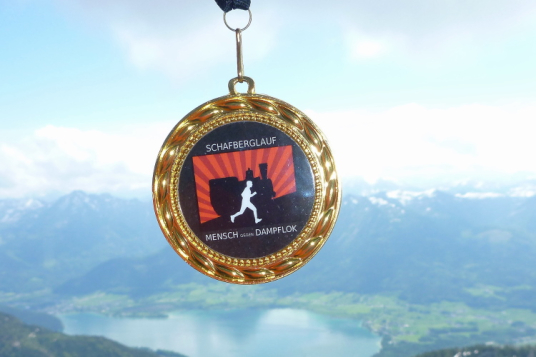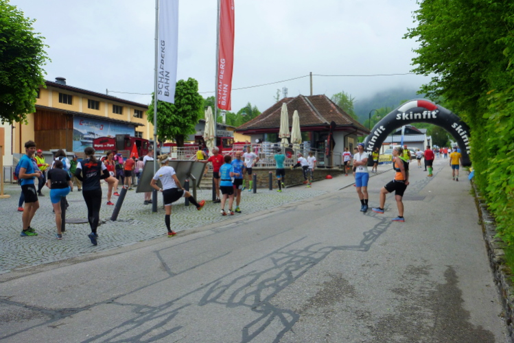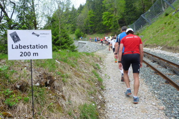 Jetzt geht es ganz schnell: Die Bahnstation ist in Sicht, die Schienen sind wieder erreicht, die ob des noch auf den letzten Metern fotografierenden Dödels letzten Helfer lachen und nach 1:11:05 Std. ist diese schöne Geschichte, deutlich früher als erwartet, vorbei. Es gibt sogar eine nette Medaille für den Hals, im selbigen verschwindet die dritte Dose meines Lebens einer österreichischen Brause. Aber erst noch wird mein Tiroler Freund Günther begrüßt, der kurz nach mir ins Ziel kommt, und den ich zehn Minuten vor mir erwartet hatte. Beim Karwendelmarsch hatte er mir seinerzeit noch die Fersen gezeigt. Die Zielverpflegung schaffen wir zu übersehen und streben direkt die letzten (nicht mehr zählenden) Höhenmeter ins Haus Schafbergspitze, von dem aus nichts vom Tal zu sehen ist.