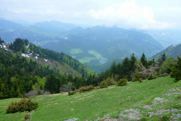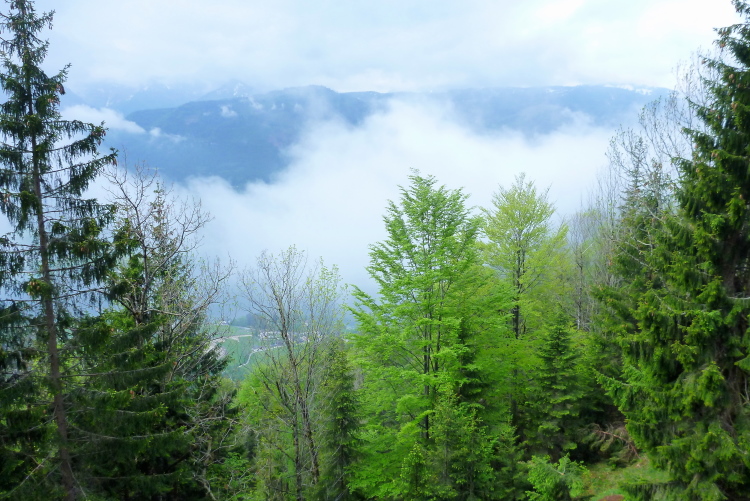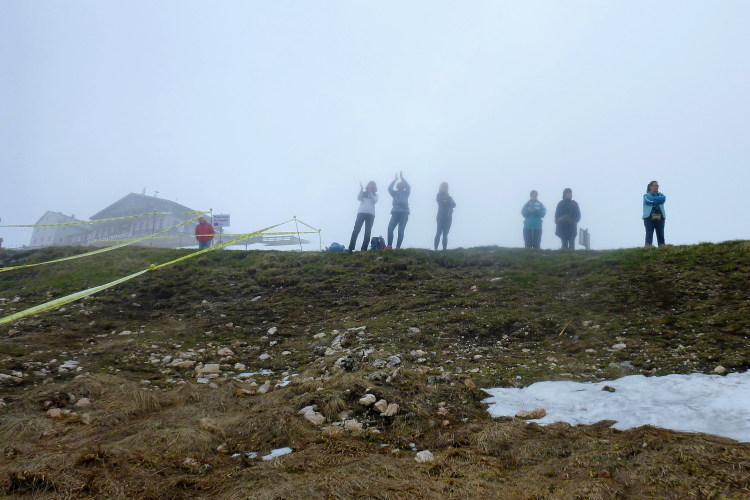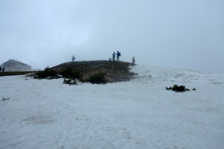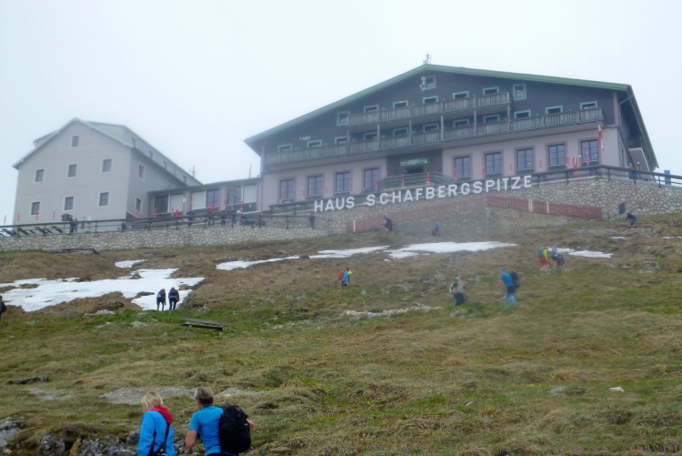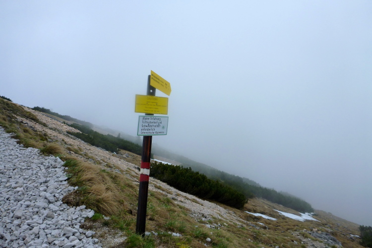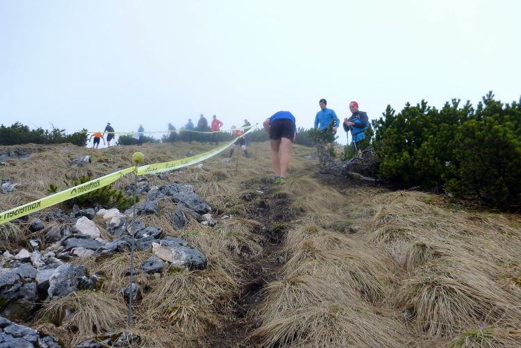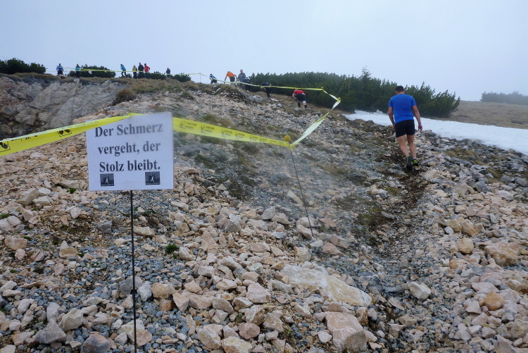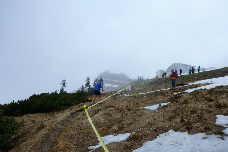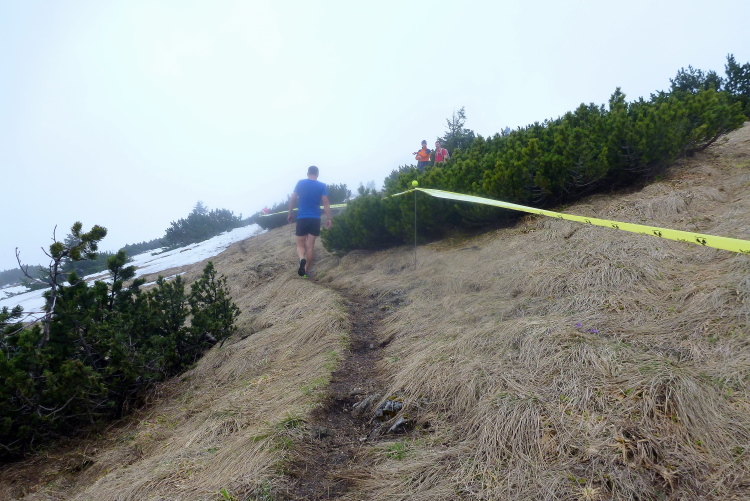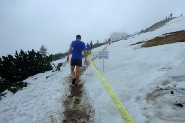heißt eine chinesische Trägerraketenreihe und genau so sieht es bei uns aus: Trotz der natürlich kurzen Strecke zieht sich die Läuferschlange im langen Marsch zäh den Berg hinauf, Träger wären jetzt angenehm. Es ist Halbzeit und der Dunst wird immer dichter, der dritte km ist bei 222 HM in dreizehneinhalb Minuten absolviert. Auch auf die Gefahr mich zu wiederholen: Es ist echt steil! Viele Mitstreiter stützen sich längst auf ihren Oberschenkeln ab und hoffen so auf Unterstützung. Mir geht es erstaunlicherweise gut, ich kann einen vergleichsweise flotten Schritt beibehalten und sammele einige, allerdings wenige, Leidensgenossen ein. Kurz vor der zweiten Labestation Schafbergalm auf 1.366 m Höhe taucht das erste Schneefeld auf.