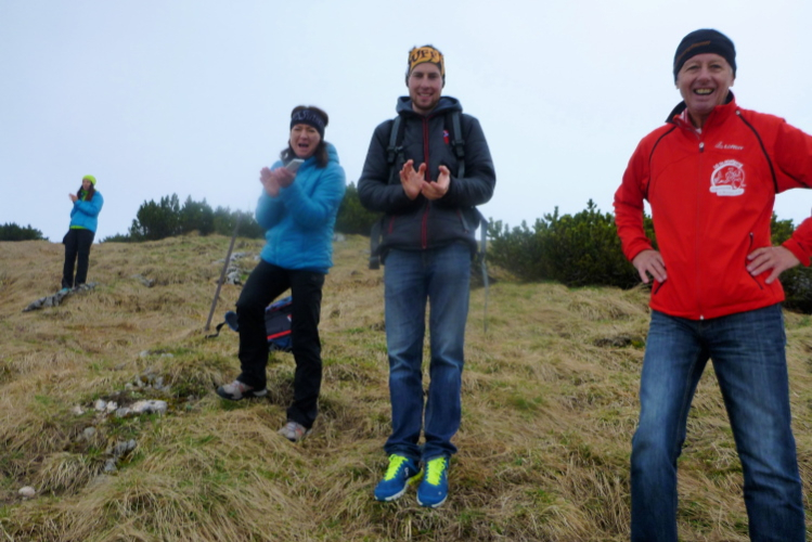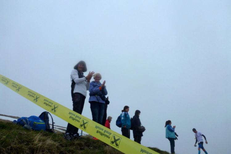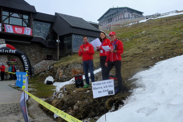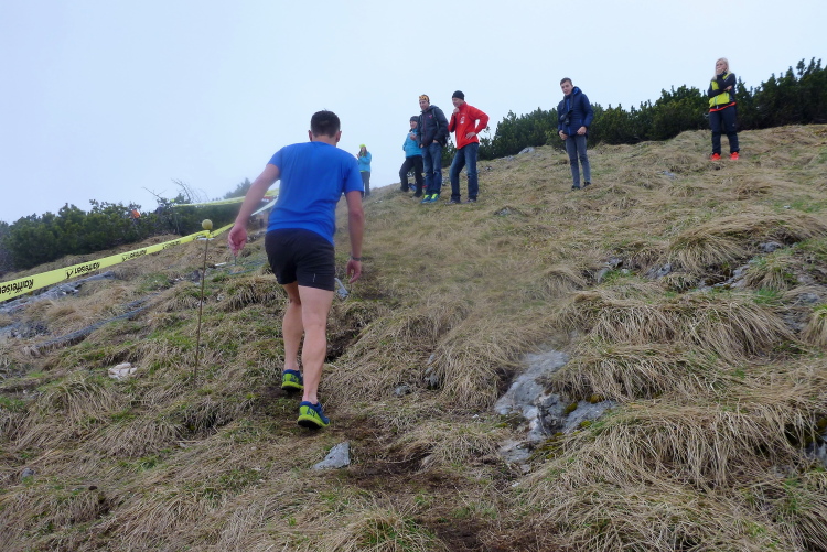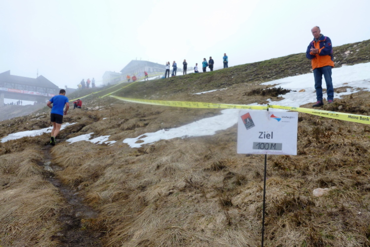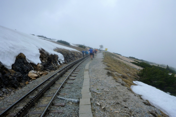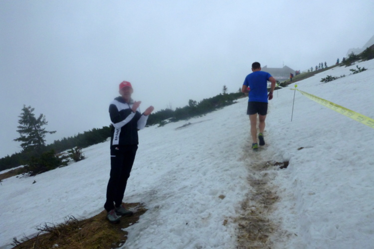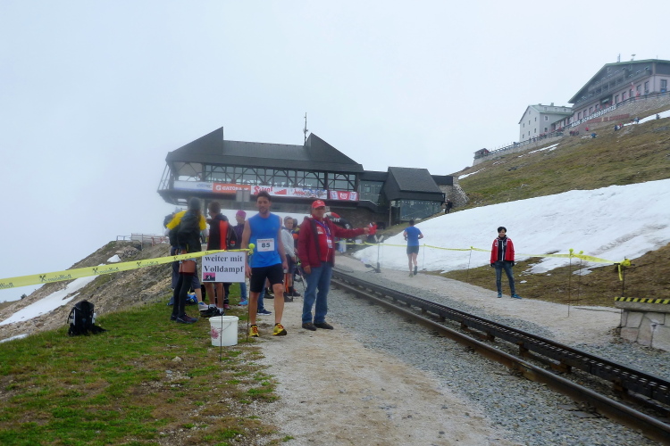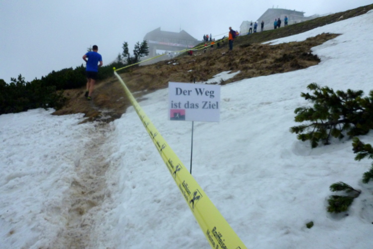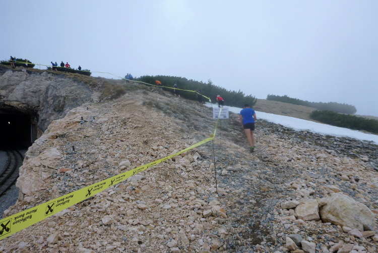 Dann ist es an der Zeit, ein Tränchen zu verdrücken, denn den Tunnel, den die Bahn nimmt, dürfen wir nicht passieren, schade. Stattdessen jagt man uns geradeaus auf einen weichen Trail und verspricht uns „nur noch 1.000 Schwellen!“. Na, wollen wir das mal glauben. An einem Flatterband vorbei bleibt es mindestens genau so steil, aber es stehen wieder ein paar Fans an der Strecke, die das nahende Ende verkünden. Dann geht es mitten über ein Schneefeld, Erinnerungen an meine Teilnahme beim Zugspitz-Extremberglauf, Gott hab' ihn selig, werden wach. Plötzlich höre ich meinen Namen und sehe Elke und Andrea von weitem winken und anfeuern. Vor mir liegt der Sperrer Franz, Pressechef nicht nur dieses und des Wolfgangseelaufs, fotografierend und grinsend im Schnee. Ein netter Kerl ist er, der Franz.
