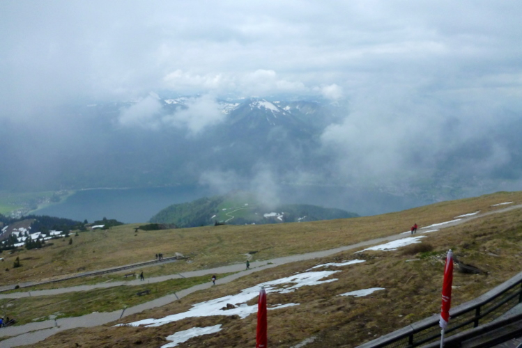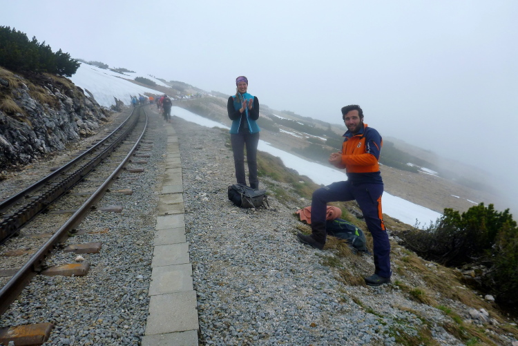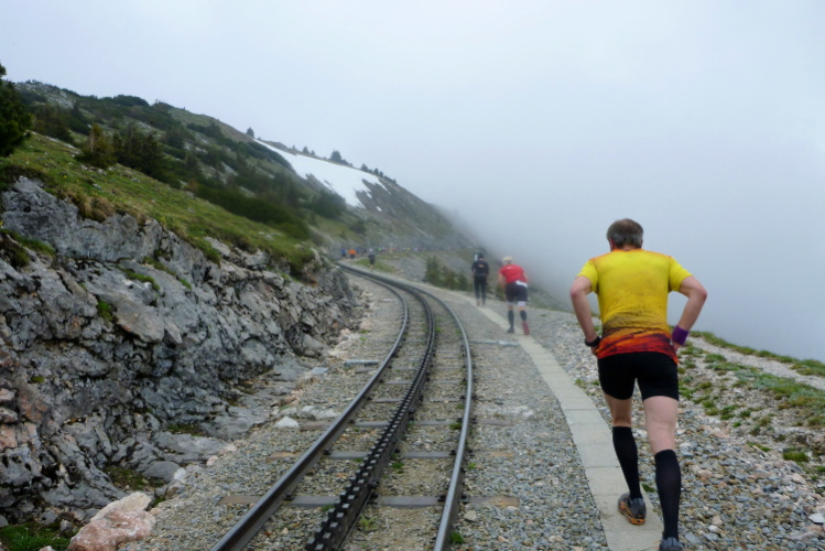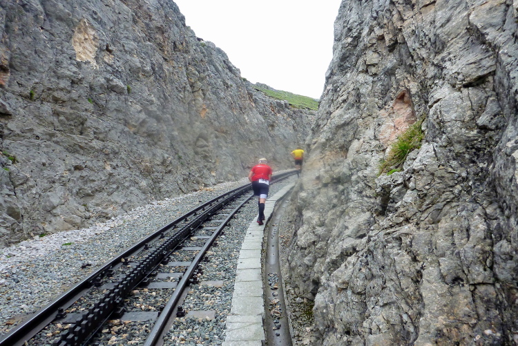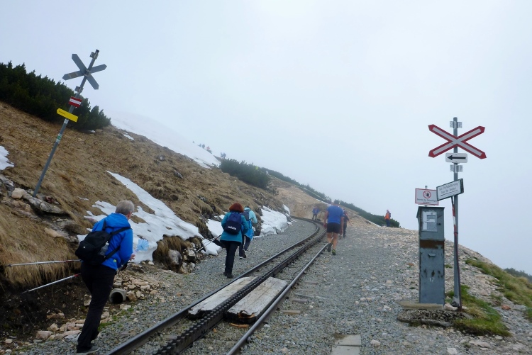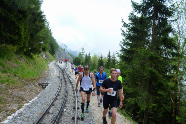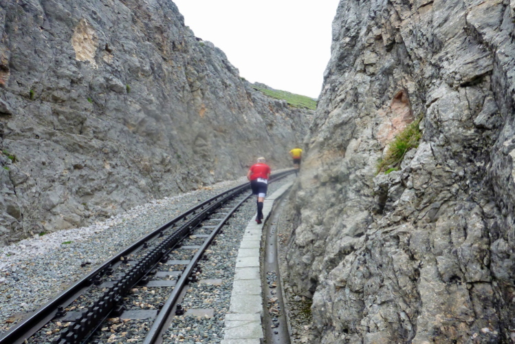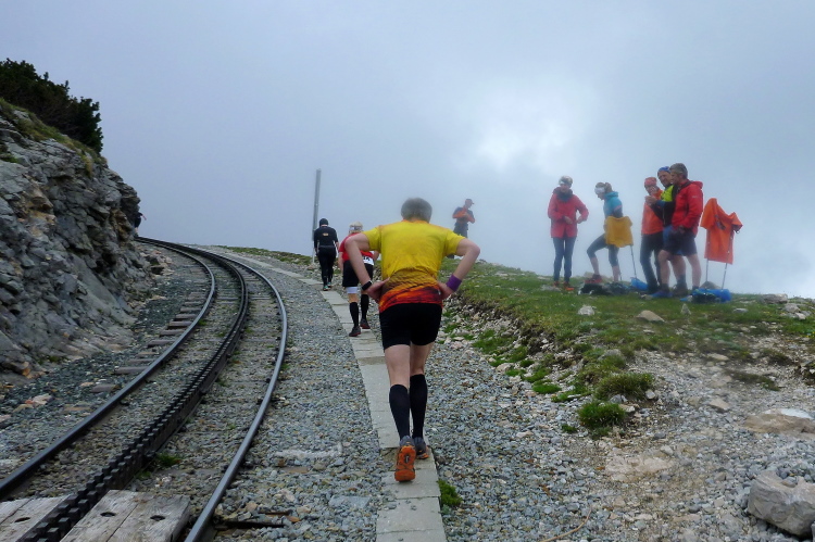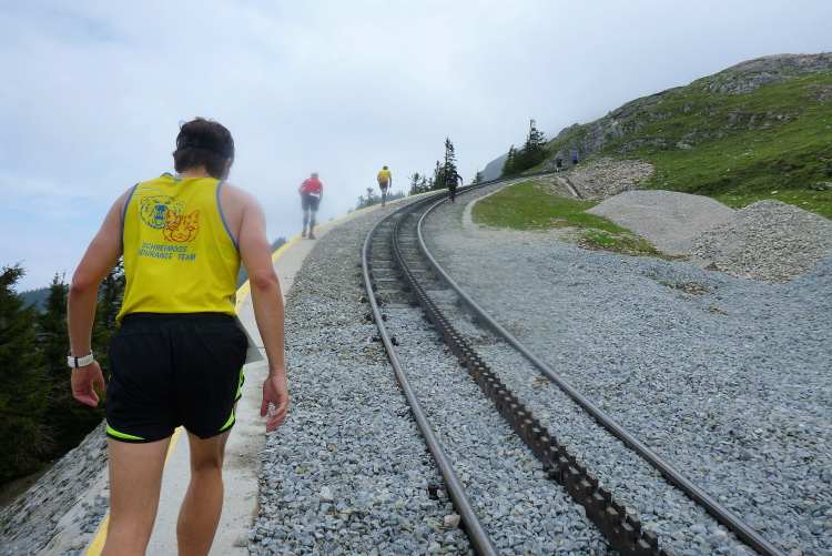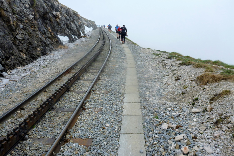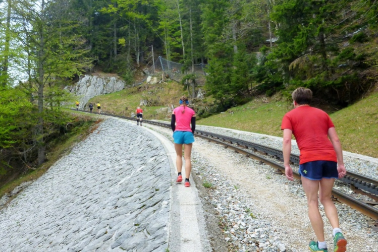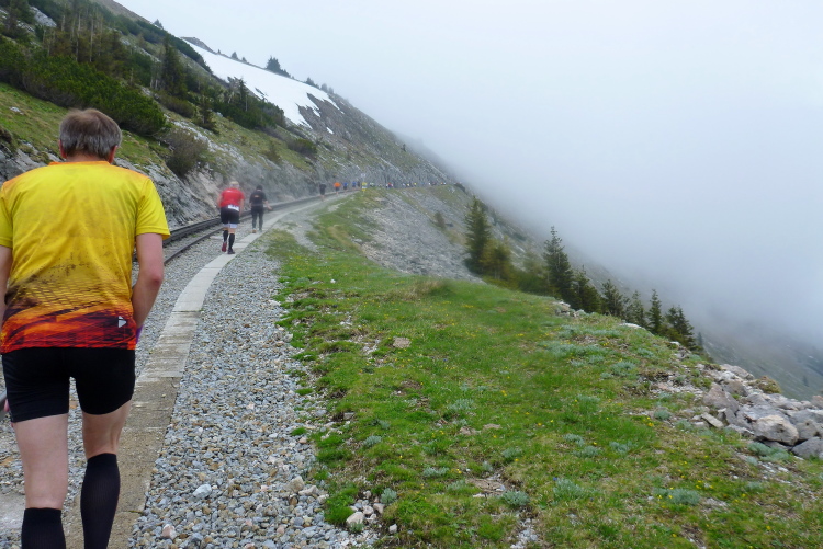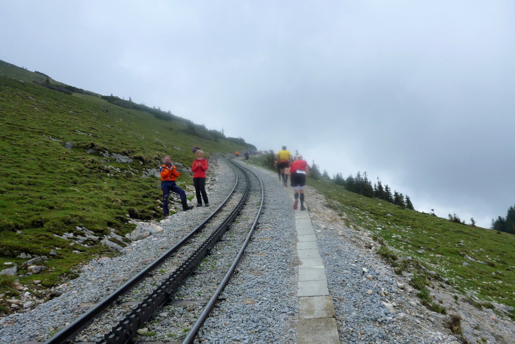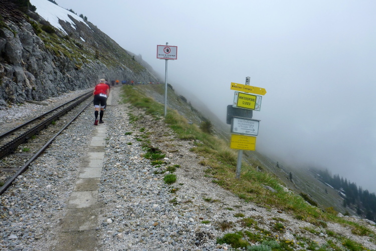 Drei, zwei, eins, los! Aufgrund der Handzeitmessung kann ich ein Startfoto schießen und mich dann unauffällig in die Läuferschar einreihen. Die stürmt die rund 400 m lange Asphaltstraße hinauf, um den Rest der Strecke unmittelbar an den Schienen zu kleben. Und die scheinen auch irgendwie klebrig zu sein, denn das Laufen ist für mich und mein Umfeld an der ersten ernsthaften Steigung direkt vorbei – es ist zu steil. Demütiges Wandern ist angesagt. Und das wird sich, um es direkt zu beichten, bis auf vielleicht 100 weitere Meter insgesamt, nicht mehr ändern. Den Blick nach oben zu haben, ist auf die Dauer auch nicht zu empfehlen, denn die Steigung (im Maximum 26°, gefühlt hat's das durchgehend) ist auch optisch heftig. Leider hat uns das Bombenwetter der vergangenen beiden Tage im Stich gelassen und der Berg ist komplett im Dunst verschwunden. Wenigstens regnet es nicht, wir sind ja schon für Kleinigkeiten dankbar.
