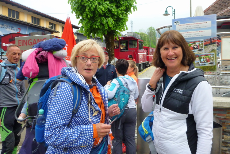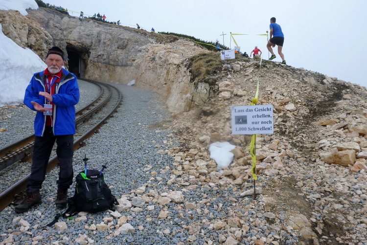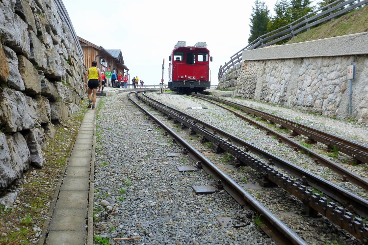 Seit 1893 befördert sie Besucher über eine Streckenlänge von 5,83 km von 540 m auf 1.732 m hinauf. Wer rechnen kann, hat also korrekt 1.192 Höhenmeter Differenz ermittelt. Und die gilt es im Wettkampf gegen die von der alten Dampfbahn vorgegebene Fahrzeit von 45 Minuten zu bezwingen. Natürlich im Idealfall schneller, was m.W. bisher erst rund zehn Personen gelungen ist. Der Tiroler Günther und der Flachlandtiroler Wolfgang kommen dafür leider nicht in Frage, aber dabei sein ist für uns das olympische Prinzip. Ganz ahnungslos bin ich nicht, habe ich doch einige knackige Bergläufe bisher absolviert, darunter den phantastischen Vertical Sommerlauf von St. Moritz auf den Piz Nair über 5,5 km und 980 Höhenmeter.