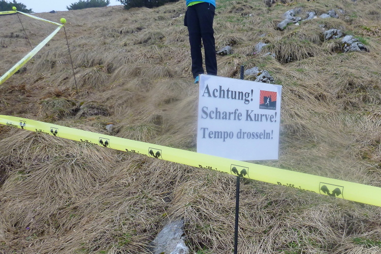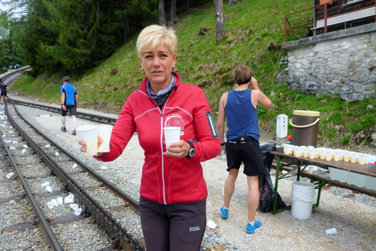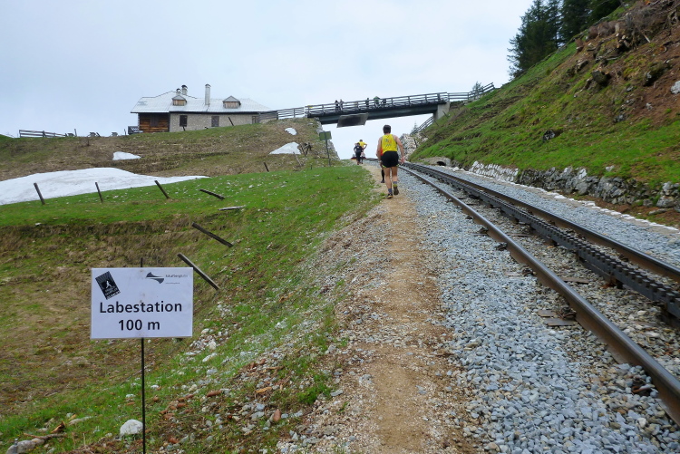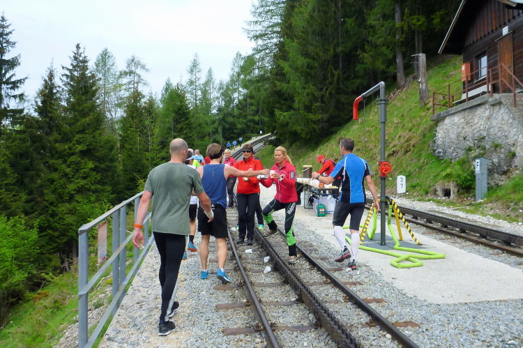 Der erste km mit 105 HM ist dank noch überschaubarer Steigung nach gut siebeneinhalb Minuten abgearbeitet, für den zweiten mit 206 HM brauchen Günther und ich schon über zwölf. Ich vermisse trotz der Uhr Km-Schilder, bis mir die alle 100 m stehenden Entfernungssteine der Bahn auffallen. Die Augen zu öffnen kann manchmal hilfreich sein. Rechts hat man zum Schutz gegen Steinschlag kräftige stählerne Fangnetze in den Berg verankert. Die erste von zwei (!) Labestationen steht an der Dorneralpe bei km 2,7 in 1.011 m Höhe. Man, besser gesagt frau, reicht uns Wasser und Iso, vergelt's Gott!