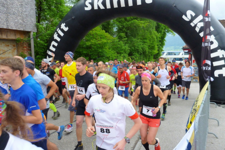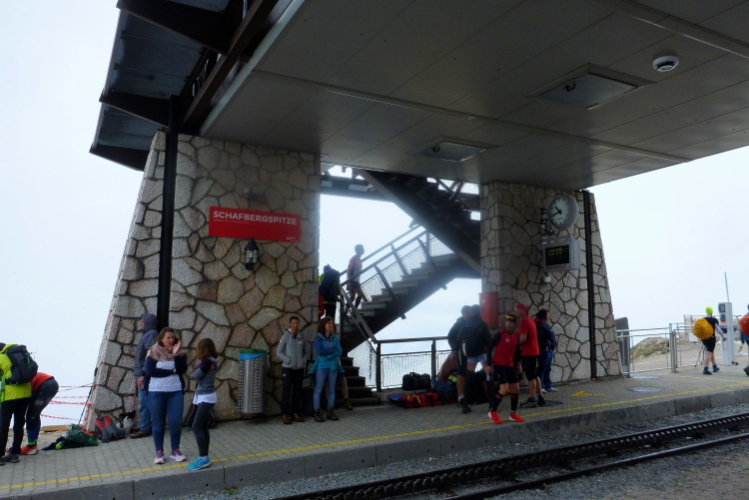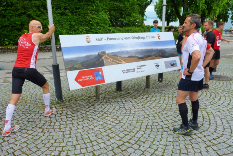 Morgens um 7 Uhr sind Günther und ich die Ersten, welche die Startnummernausgabe an der Talstation der Schafbergbahn aufsuchen. Unsere Gutscheine aus der reich gefüllten Startertüte (inkl. Shirt!) für die im Nenngeld enthaltene Rückfahrt und die für unsere Mädels (eine Begleitperson darf zum Sonderpreis für 18 Euro hin- und zurückfahren) können wir noch nicht einlösen, die Fahrkartenausgabe ist noch geschlossen. Nach dem natürlich viel zu üppigen Frühstück sind wir gute zwei Stunden später lauffertig wieder vor Ort, wo die Damen sich erfolgreich um die Tickets bemüht haben und mit unserer Wechselkleidung die Bahn um 9:20 Uhr nehmen. Natürlich hätten wir sie (also die Wechselkleidung) auch mit der Extrabahn des Veranstalters noch früher hochfahren lassen können.