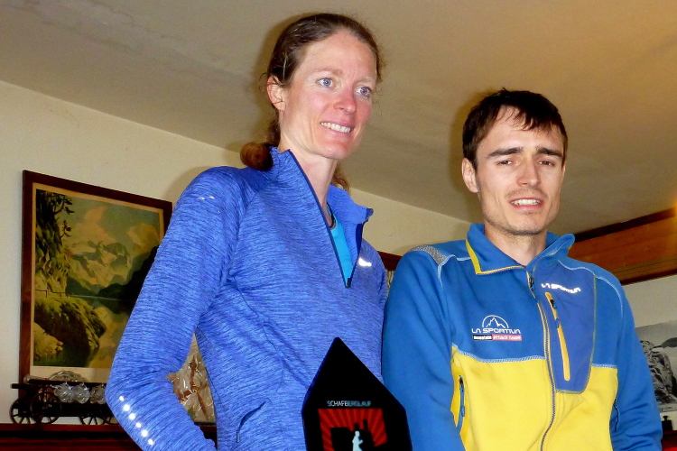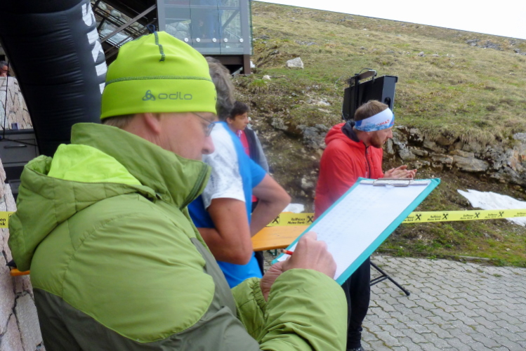 Nach einem kurzen Aufwärmen stehen 228 Erwartungsfreudige, von denen 226 den Gipfelsturm bestehen werden, parat. Ich freue mich, mit Dr. Andrea Mayr die erneute Topfavoritin für ein Foto gewinnen zu können. Die 39jährige Ärztin kann u.a. sechs Weltmeistertitel, fünf Europameistertitel und zwei Olympiateilnahmen als herausragende Karrierehöhepunkte vorweisen. Bereits zweimal 2015 und 2018 konnte sie als Gesamtsiegerin das gesamte Männerfeld distanzieren! Ihr Streckenrekord aus dem Jahr 2015 steht bei 44:40 min. Nach meinen Erfahrungen vom Vertical Up muss ich mit mindestens 1:20 Std., vielleicht deutlich länger rechnen.
