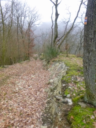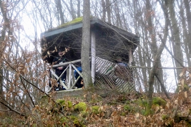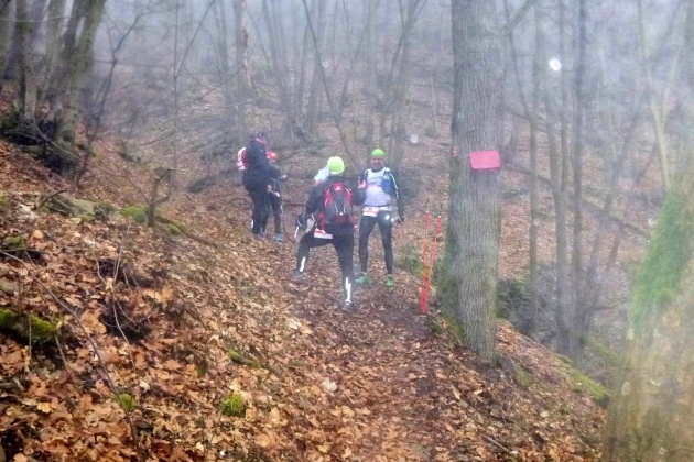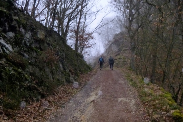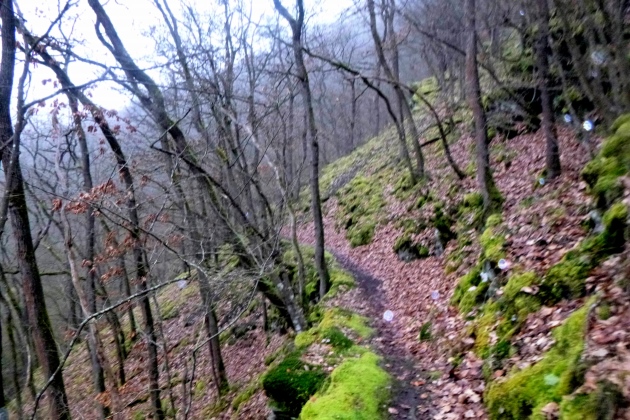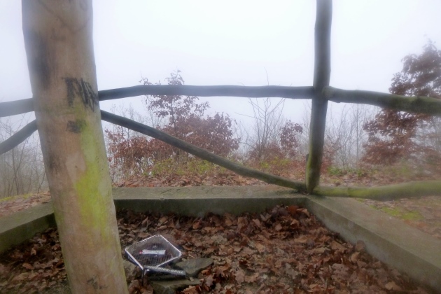 Im Anstieg kommt der Nebel zurück und es wird dunkel, mit jedem Schritt mehr. Etwa 4 km sind‘s bis oben. Naja, bis fast oben. Hat man das Römerkastell passiert, kommt nicht mehr viel Höhe. Eine Runde um den Gipfel, den Briefkasten suchen – Der Schmerzmacher liegt drin - Leseprobe entnehmen und runter. Der Nebel wird dichter, die Stirnlampe stört, man sieht kaum 3 Meter weit. GPS kommt unter den hohen Bäumen auch nicht so recht zum Zug.