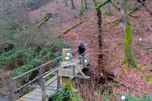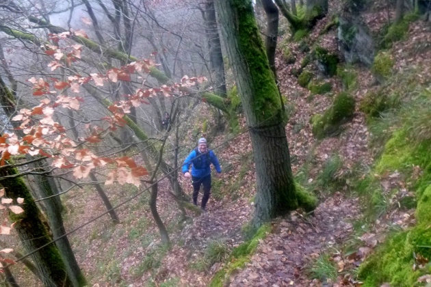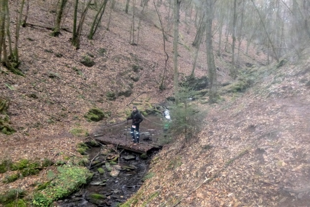 Tja, gut die Hälfte ist rum. Berg der Tränen, oben wieder mit Leseprobe – Tränenbringer, wie passend – dann runter ins Dörsbach- und Hasenbachtal. Die guten Wege sind nun passe, der Schlamm wird zum klebrigen Kleister, glitscht um die Treter, quillt über den Rand in die Schuhe. Hier können sämtliche Sünden abgebüßt werden. Und wer sich nicht in den Motker legen möchte, tapst sehr, sehr vorsichtig und sehr, sehr langsam daher. Aber Cutoff im Ziel ist 20:00, da will der Schinder Party machen. Das sollte man im Auge behalten.