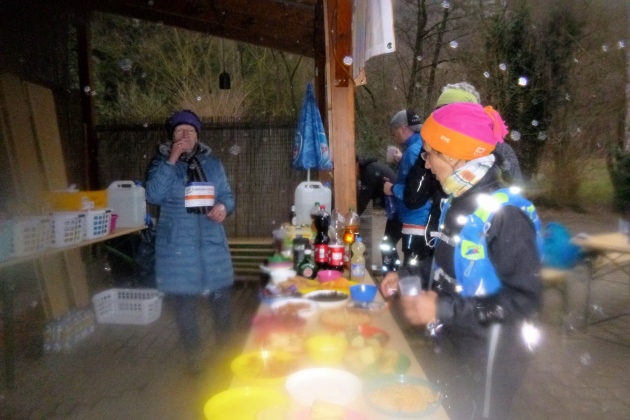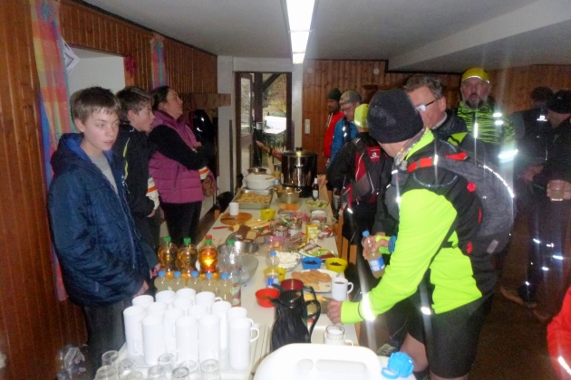 Kurz vor 5: Endlich isotonische Labung. Und wieder erwachen müde Lebensgeister. Jetzt noch den Grauen Kopf und dann ins Ziel. 15 km werden es noch sein, das passt. Die versammelte, inzwischen wieder muntere Schlusstruppe zieht davon. Jeder wie er kann.