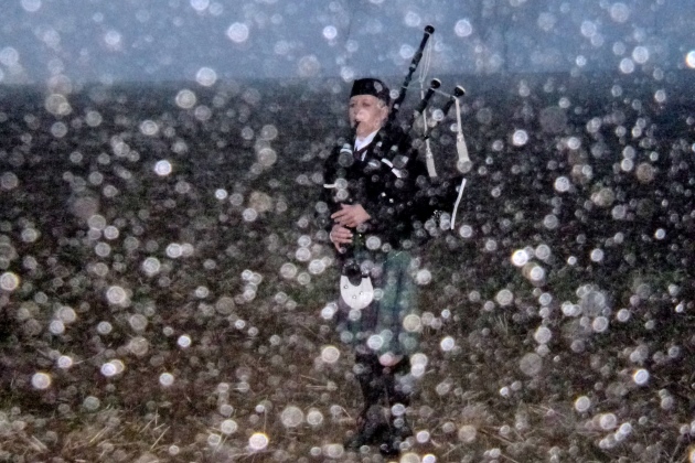 Pünktlich um 8 wirft der Schinder alle Besucher raus. Auf die Strecke. Gut, vorher gabs Frühstück und klönen, es sind nämlich alle, alle gekommen! Fröhlich und heiter traben wir ab. Kaum hat der Nebel die Vordersten geschluckt, tönt geisterhafte Musik durch den Dunst. Mitten auf dem Feld, aus Koblenz angereist, steht eine one-man-Band mit Kilt und Dudelsack. Ganz große Klasse!