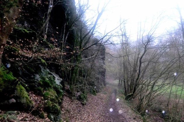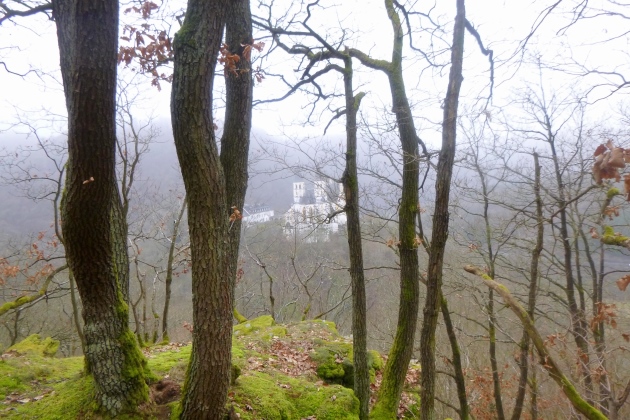 Im Nebel traben/gehen wir über den Gipfel auf Kloster Arnstein hin. Tobias, der Besen, trabt neben mir. Ich bin wieder ganz, ganz hinten. Immer wieder scheiden einige aus und Tobias rückt vor. Er ist supernett und hat alle im Blick. Kurz vor dem Kloster biegen wir auf einen steilen Bergpfad ein. 100 HM sind es bestimmt rauf zur Kanzel. Hier sollen wir die nächste Leseprobe holen. Aber keine Chance - irgendwer hat das Buch so toll gefunden und nahms gleich in toto mit. In dem Fall gilt: Selfie am Briefkasten machen und wacker weiter!